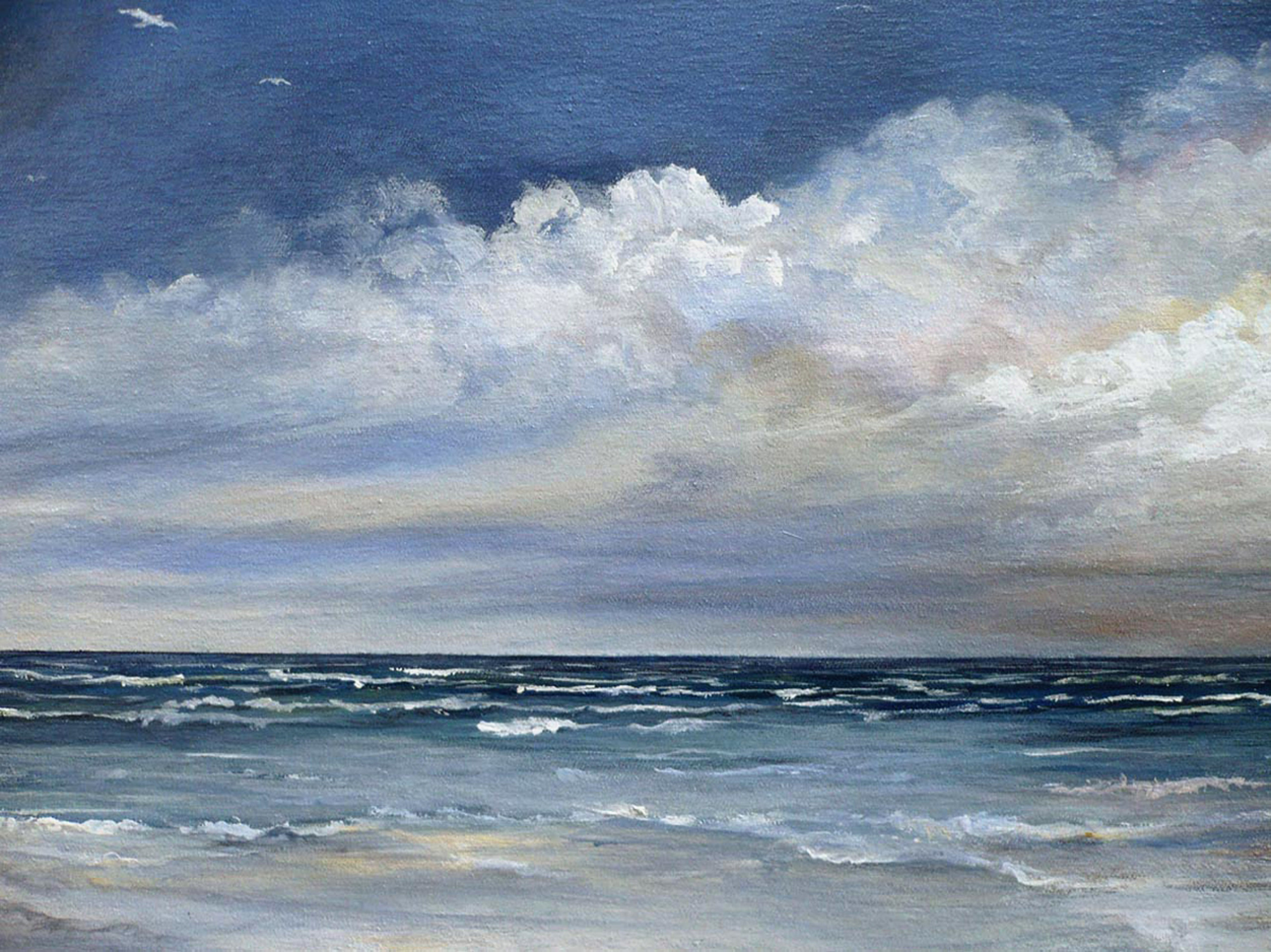 De zee is op geen enkel moment hetzelfde. Ik houd ervan als de lucht betrekt en de wolkenpartijen gaan stoeien met het licht. Dergelijke luchten blijven boeiend om te schilderen.