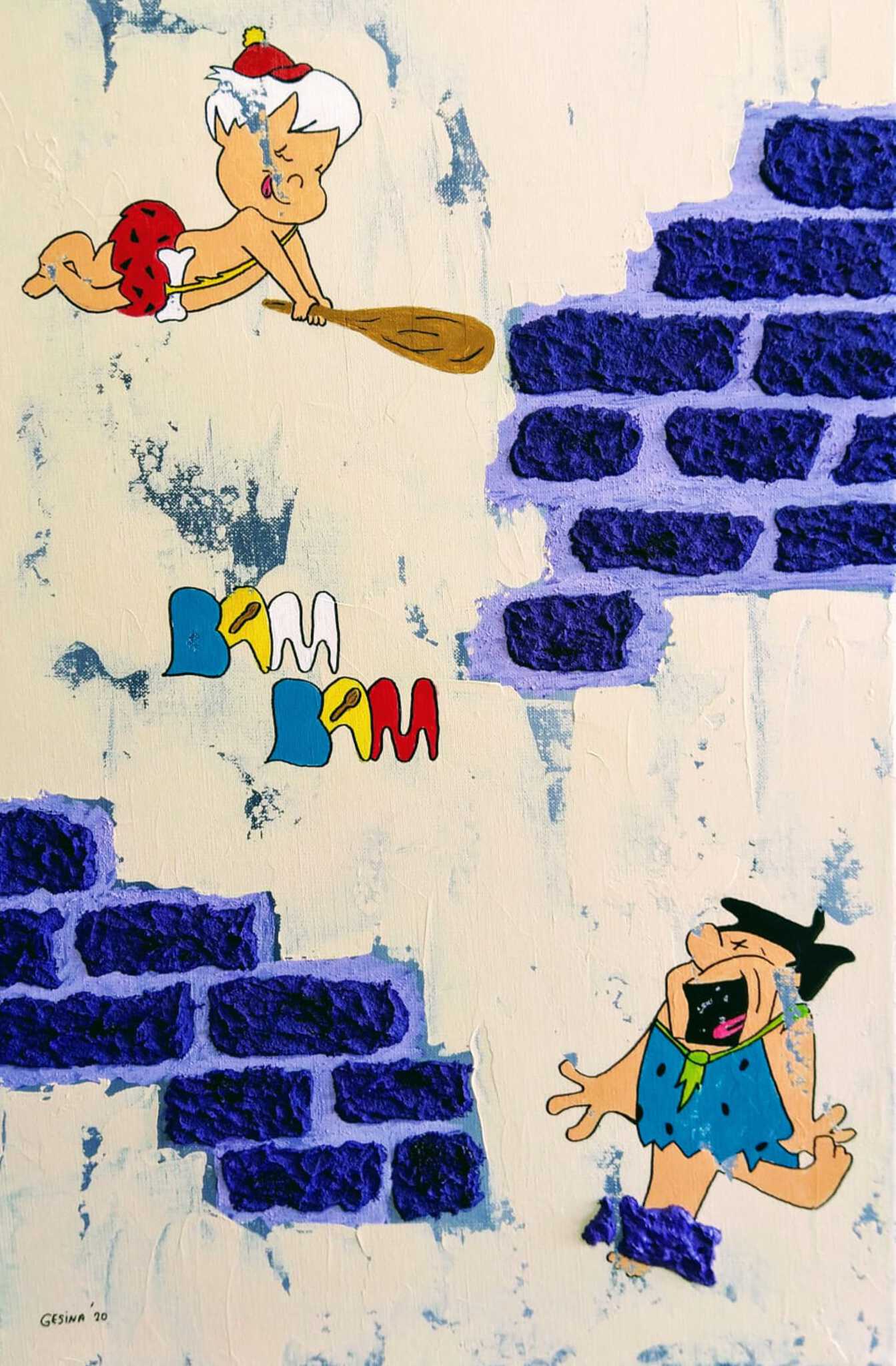 Schilderij Wit Grijs Rood Geel Blauw Paars Bruin Vermeer Gea Fred Gesina Bambam Flintstones
