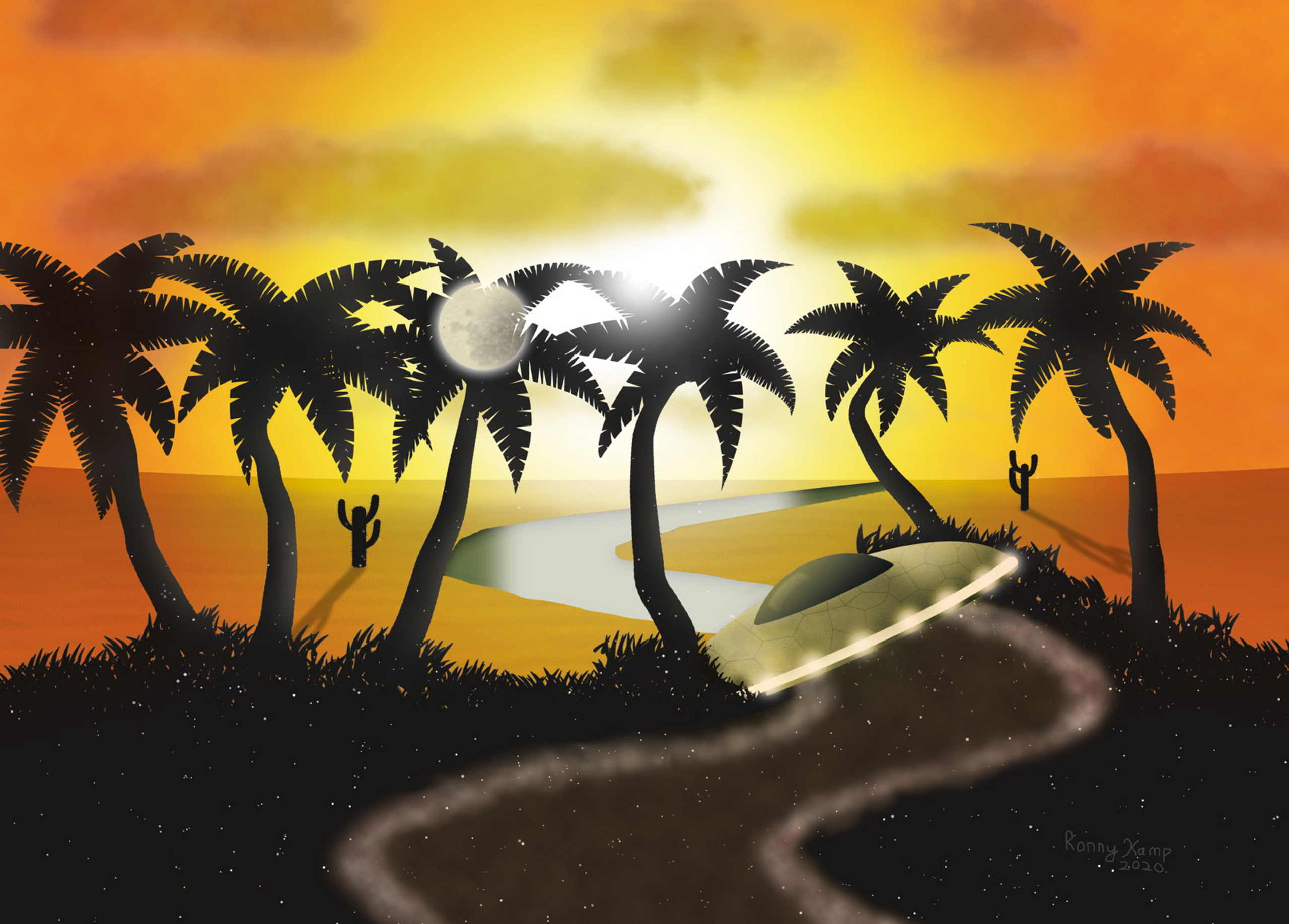 Een vliegende schotel schiet op mysterieuze wijze de ruimte uit de woestijn in. Verkrijgbaar in verschillende formaten op verschillende marerialen. Van 20x30cm t/m 120x160cm. Afdruk op papier, canvas of aluminium is allemaal mogelijk.