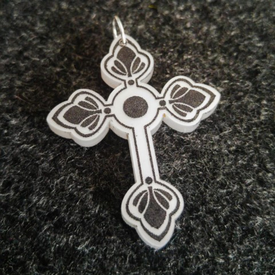 Hanger Kruis is uitgevoerd in lasergesneden en lasergegraveerd acrylaat. Het gegraveerde deel is ingekleurd. De hanger kan in diverse afmetingen en kleuren uitgevoerd worden.
