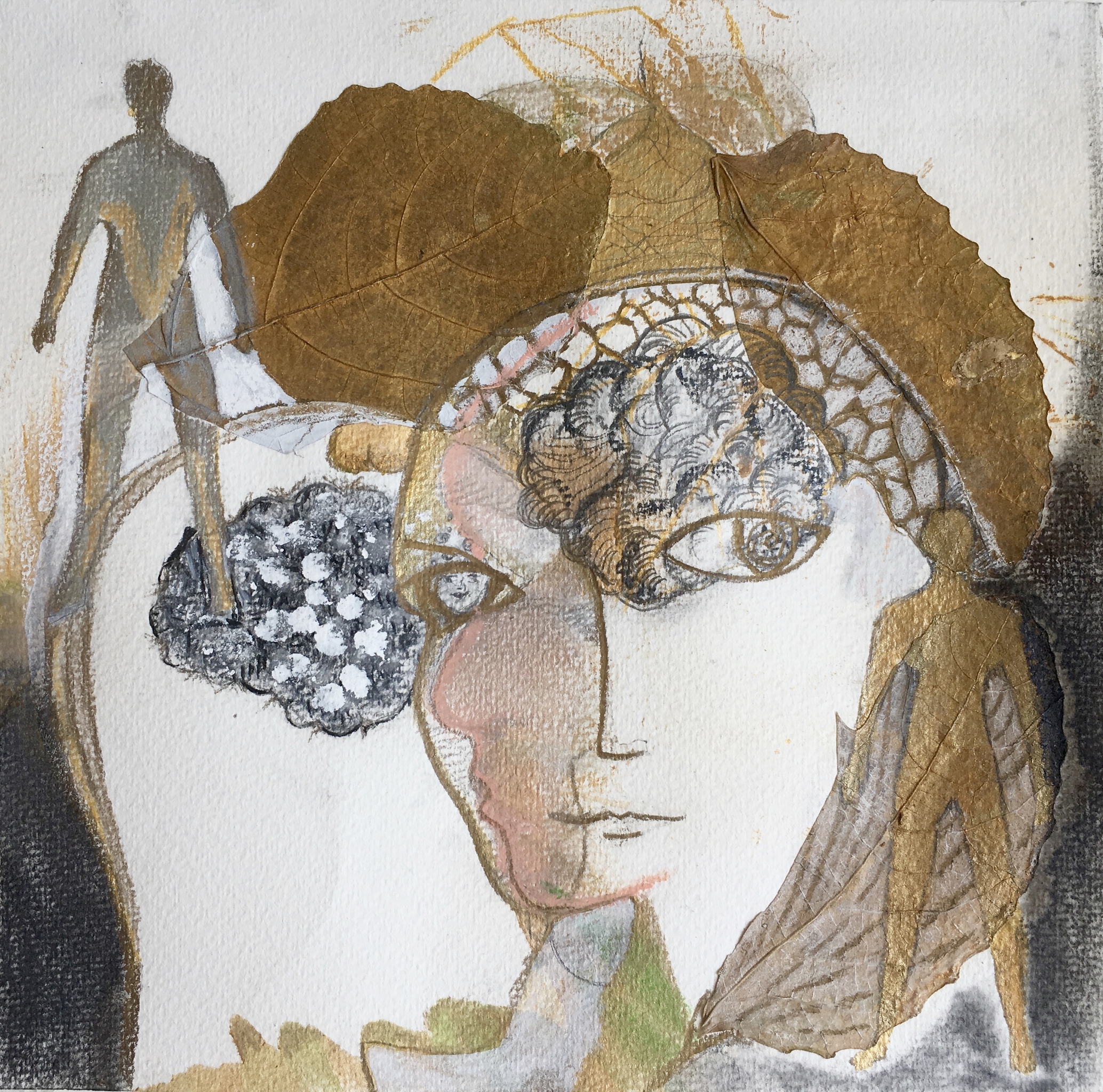 Portret, mens, figuur, tekening met gedroogde bladeren op papier.
