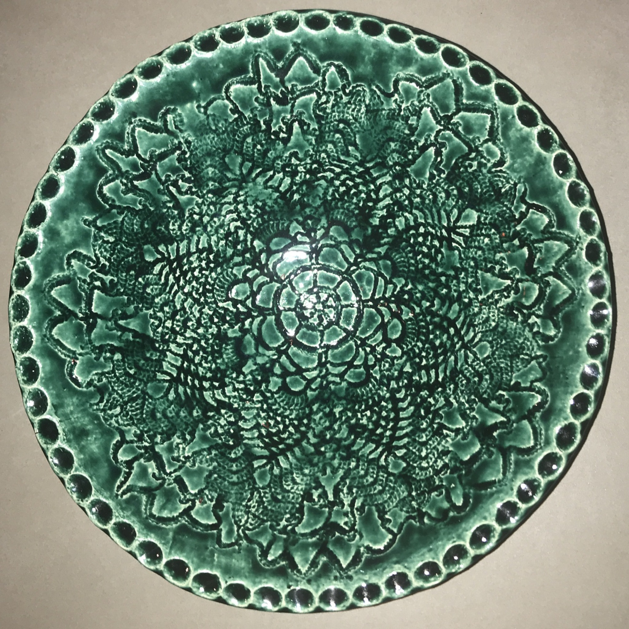Keramieken schaal van witbakkende fijne chamotte klei met een afdruk van een gehaakt kleedje erin. Groen geglazuurd.