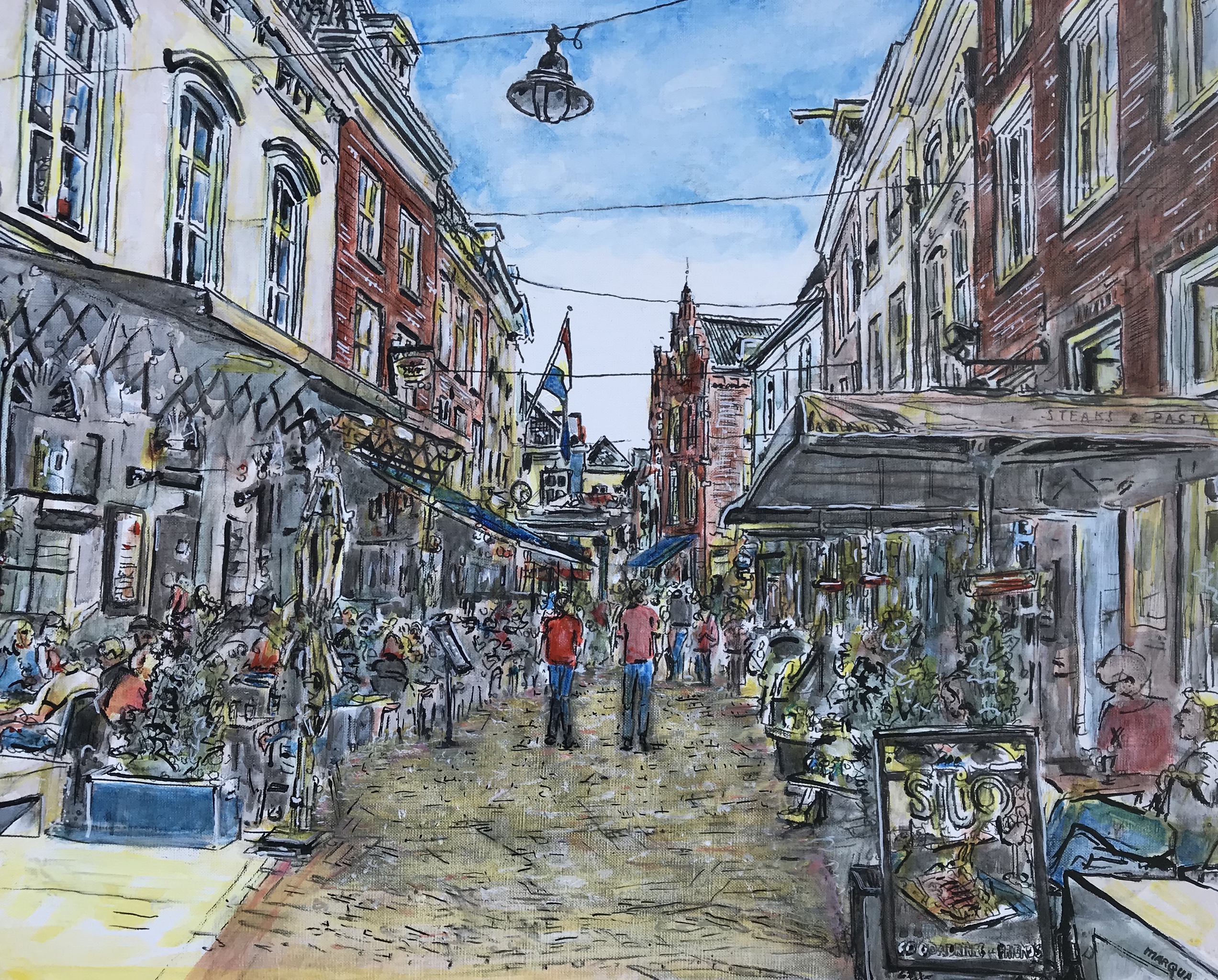 Realistisch Doek Restaurant Inkt Linnen Veulen Stad Stadsgezicht Terras Voetgangers Café Tante Rietpen Bourgondisch Denbosch Christoffel Shertogenbosch Uilenburg Korenbrugstraat Reinders Cafereinders Cafemntante Cafehetveulen