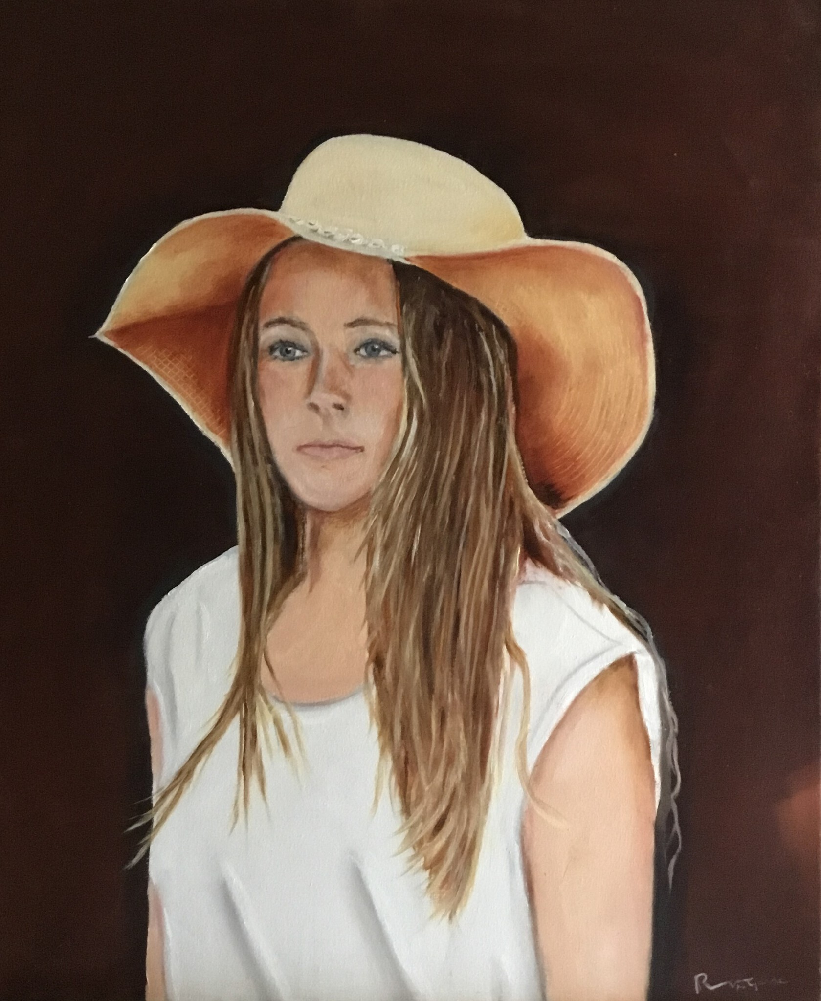 Portret in olieverf van 15jarig meisje met een hoed.