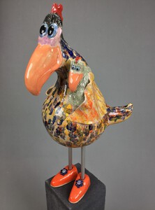 De vogel heeft vrolijk gekleurde details op de vleugels en rond het hoofd. Hij brengt een mooie bos rode rozen. De hierbij opgegeven maten zijn exclusief aluminium benen/poten en sokkel van graniet (ook te leveren met betonnen sokkel (15x15x30 cm). Totale hoogte beeld incl. betonnen sokkel is ca. 85 cm