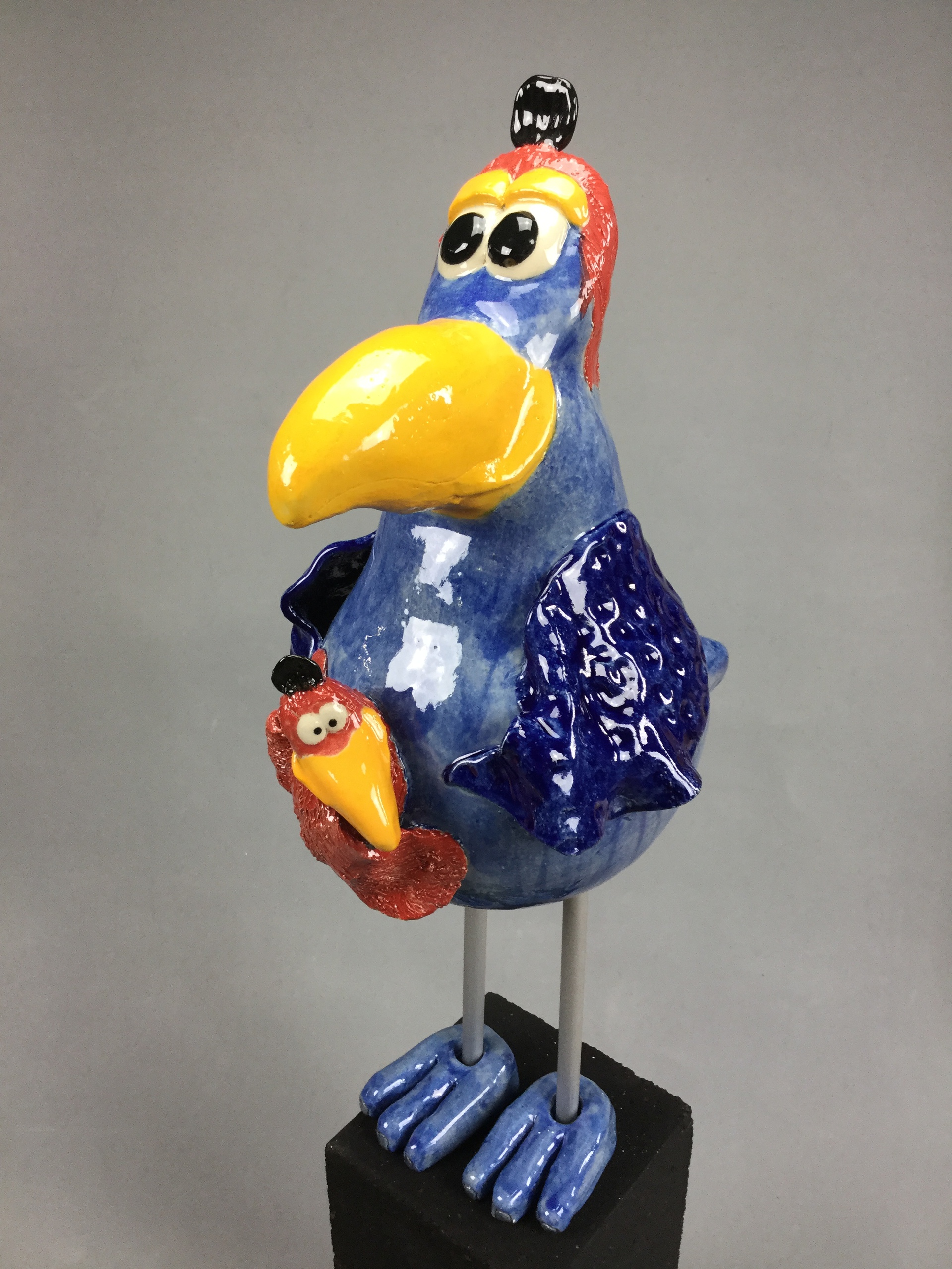 Deze blauwe vogel heeft een kleintje aan zijn borst gedrukt. Het jonkie kijkt guitig uit zijn ogen. De hierbij opgegeven maten zijn inclusief aluminium benen/poten, voeten van keramiek en betonnen sokkel (15x15x30 cm)