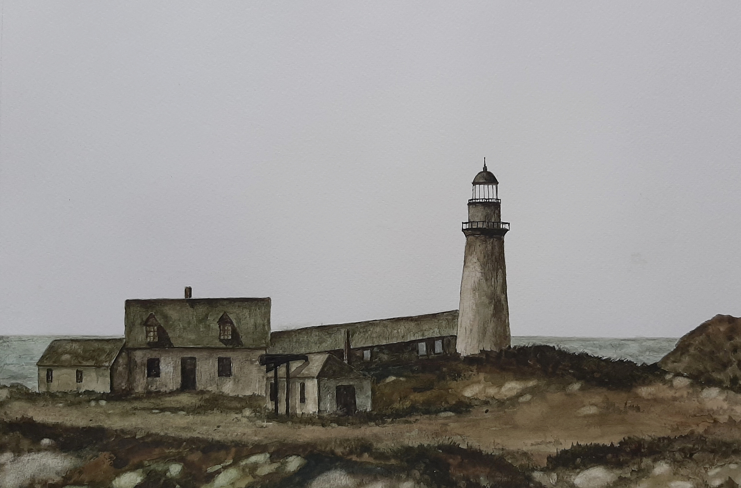 Geïnspireerd door de vuurtorens van Edward Hopper en Andrew Wyeth heb ik inmiddels zelf ook al meerdere vuurtorens gschilderd. Lang geleden enkele Bretonse (in olieverf) en in 2019 als aquarel, in de kleuren (sepia-achtig) van de farmhouses van Andrew Wyeth. Lighthouse Cape Forchu. Het betreft in werkelijkheid de remake van de vuurtoren op Nova Scotia (Canada) voor de zwart-wit film The Lighthouse (2019). De aquarel is gemaakt op 300 grams Canson Montval papier. De vermelde prijs is exclusief passe-partout en lijst.