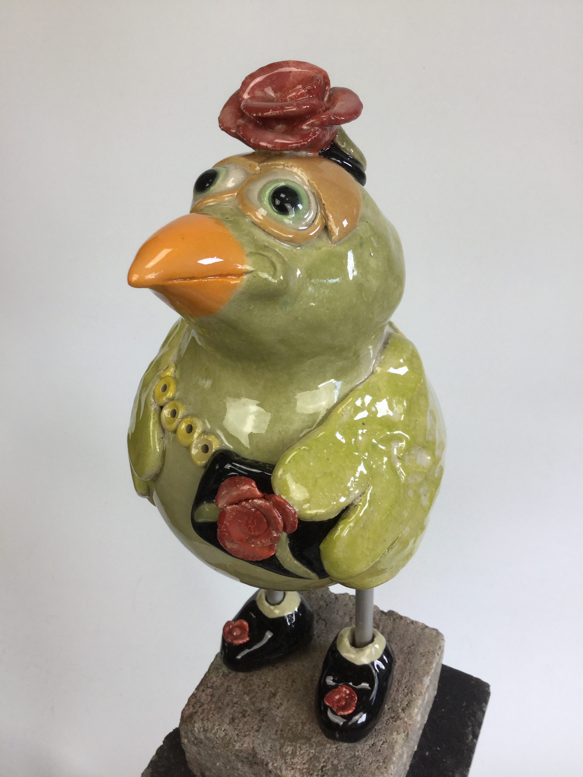 Figuratief Modern Geel Vogel Groen Kind Kleurrijk Beeld Dier Sokkel Tuin Klei Handgemaakt Geboorte Vrolijk Uniek Buiten Huwelijk Cadeau Sculptuur Geschenk Keramiek Betaalbaar Verjaardag Glazuur