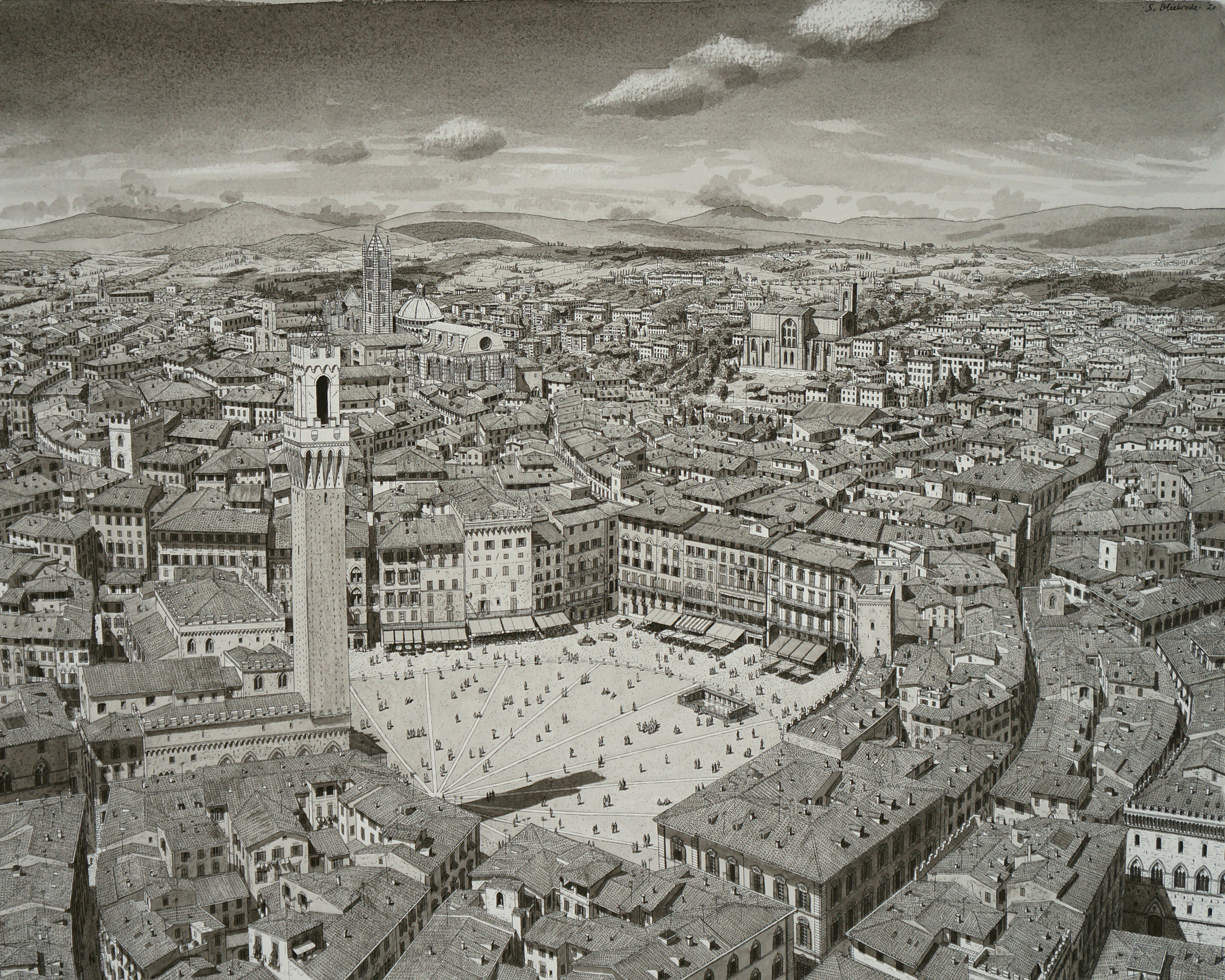 Italië Siena Toscane Kunst Architectuur Tekening Mensen Zomer Perspectief Zwart Wit