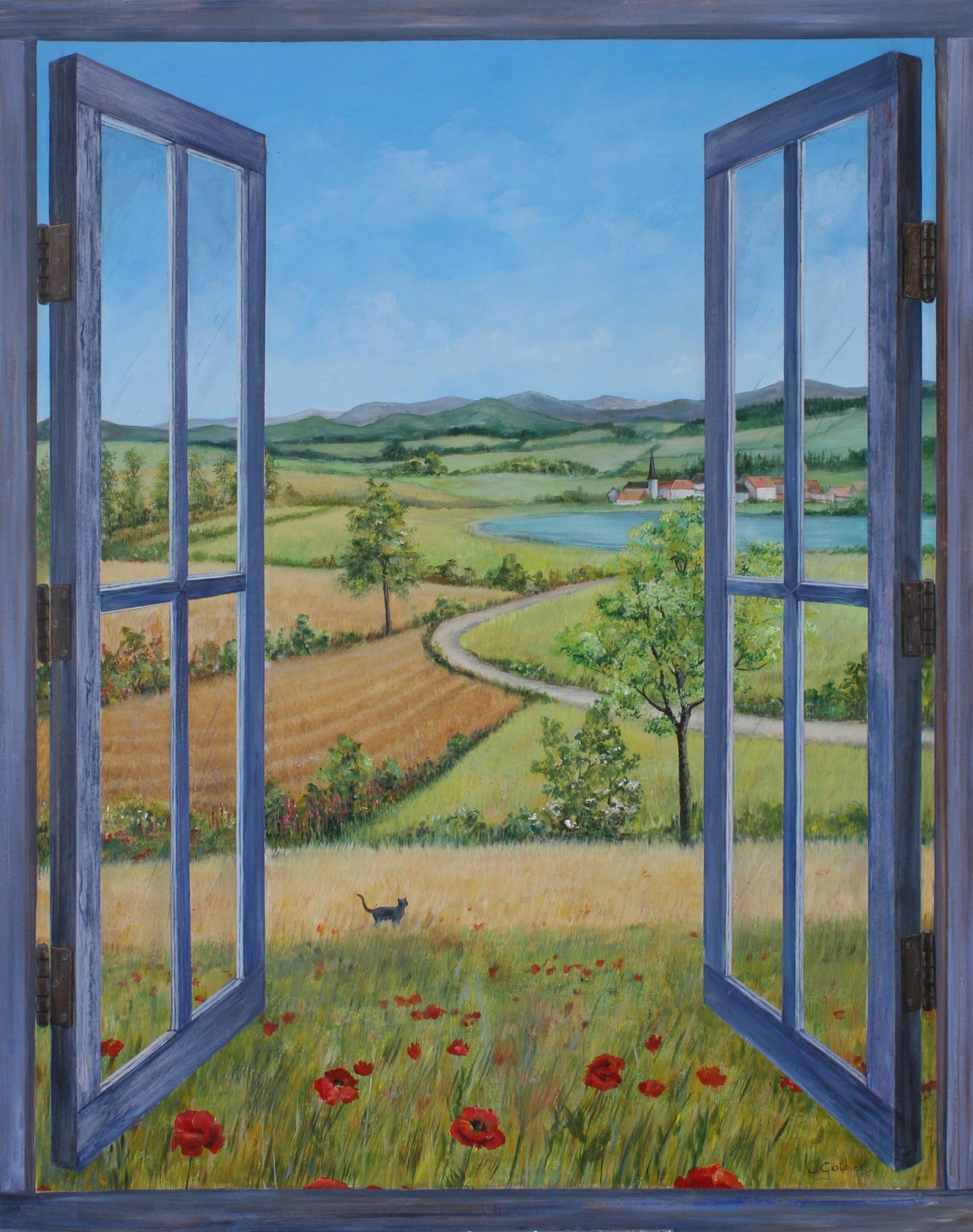 Ik maak regelmatig Trompe 'l oeils. Deze muurschildering maakte ik in opdracht in een tuin. Tegenwoordig maak ik ze ook vaak in echte raamkozijnen, geflankeerd door bewegende ramen die je ook werkelijk dicht kunt doen.