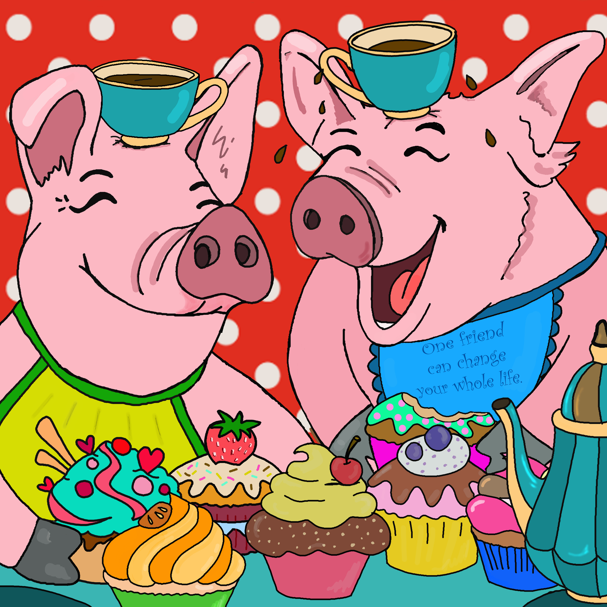 Friends Fun Varkens Blij Lachen Verjaardag Taart Vrienden Pigs Happy Kinderkunst Lol Birthday Designer Thea Dankbaar Cupcakes Kleurrijkekunst Hightea Kinderillustraties Happyart Vrolijkekunst Mirjamgriffioenart Mirjamgriffioen Caribbeanartist