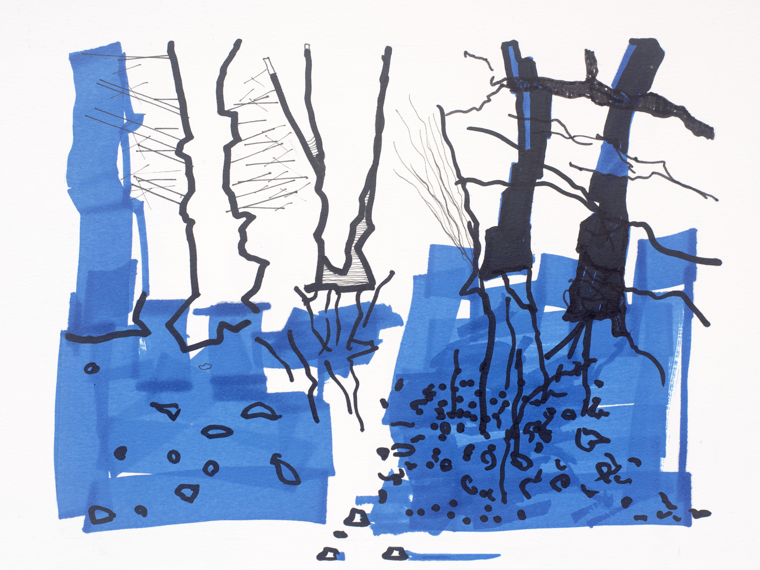 Wit Zwart Landschap Blauw Papier Geabstraheerd Tekening Natuur Bomen Inkt Pen