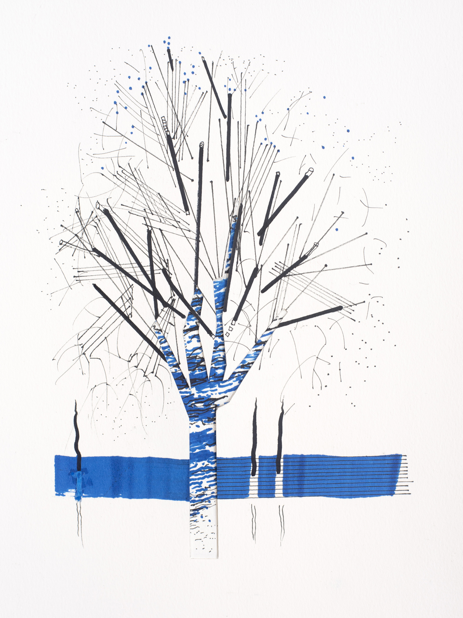 Wit Zwart Landschap Blauw Papier Geabstraheerd Tekening Natuur Bomen Inkt Pen Kerst