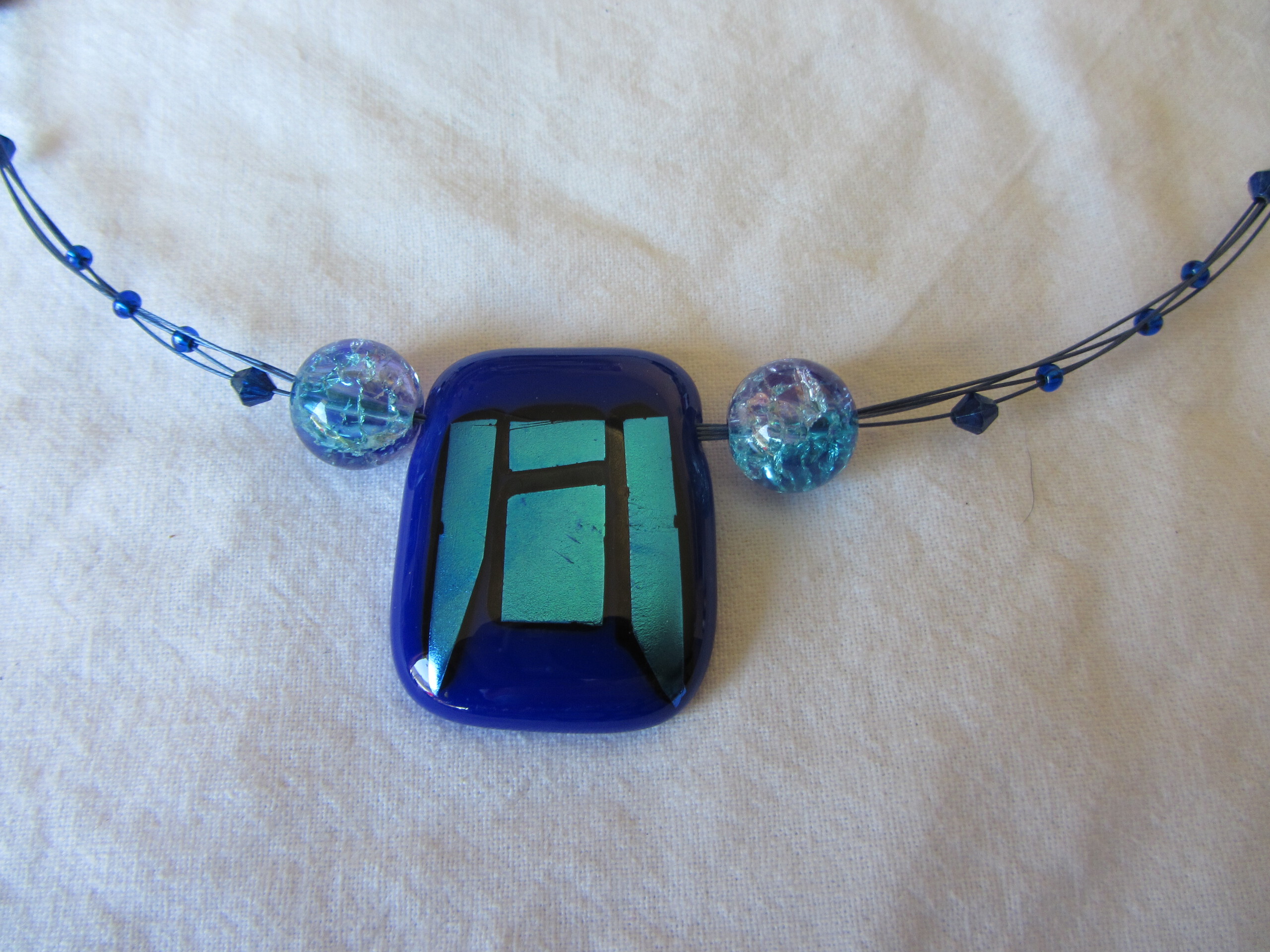 blauw glas aan meerdere blauwe metaaldraden met kralen
