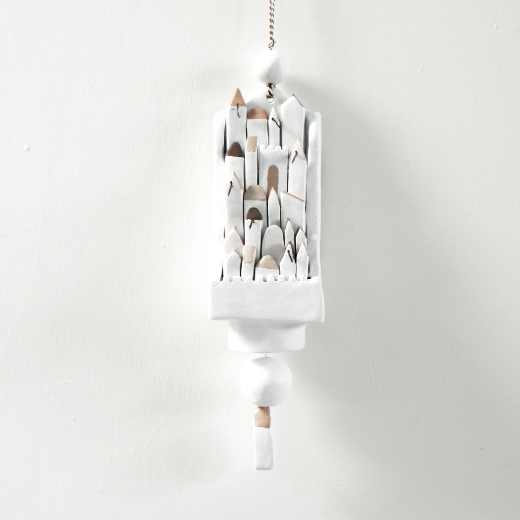 Klein en fijn, wit en delicaat en brengt je terug naar dorpjes aan de Middellandse Zee. Een ingetogen kleine versiering, met gestileerde witte huisjes en af en toe een bruin of beige accent. Miniatuur diorama's staan het je niet toe snel of gehaast te werken, dus het duurde even voordat alles af was. Maar het was het zeker waard. Het maken van kleine diorama's vind ik heerlijk. Ze zijn niet gebaseerd op echte plekken, maar een product van mijn eigen verbeelding. De regels van de zwaartekracht tellen niet helemaal in mijn kleine werelden, het is puur allemaal fantasie. De basis voor deze hangende stad is gemaakt van papier maché. De rest van de stad is gemaakt van klei, met wat kleine beetjes papier. Alles wat je ziet is met de handgemaakt en hand beschilderd met acrylverf. De hele diorama is afgewerkt met een aantal lagen vernis. Formaten: Hoogte: 27 cm Breedte: 6.8 cm Diepte: 5.8 cm