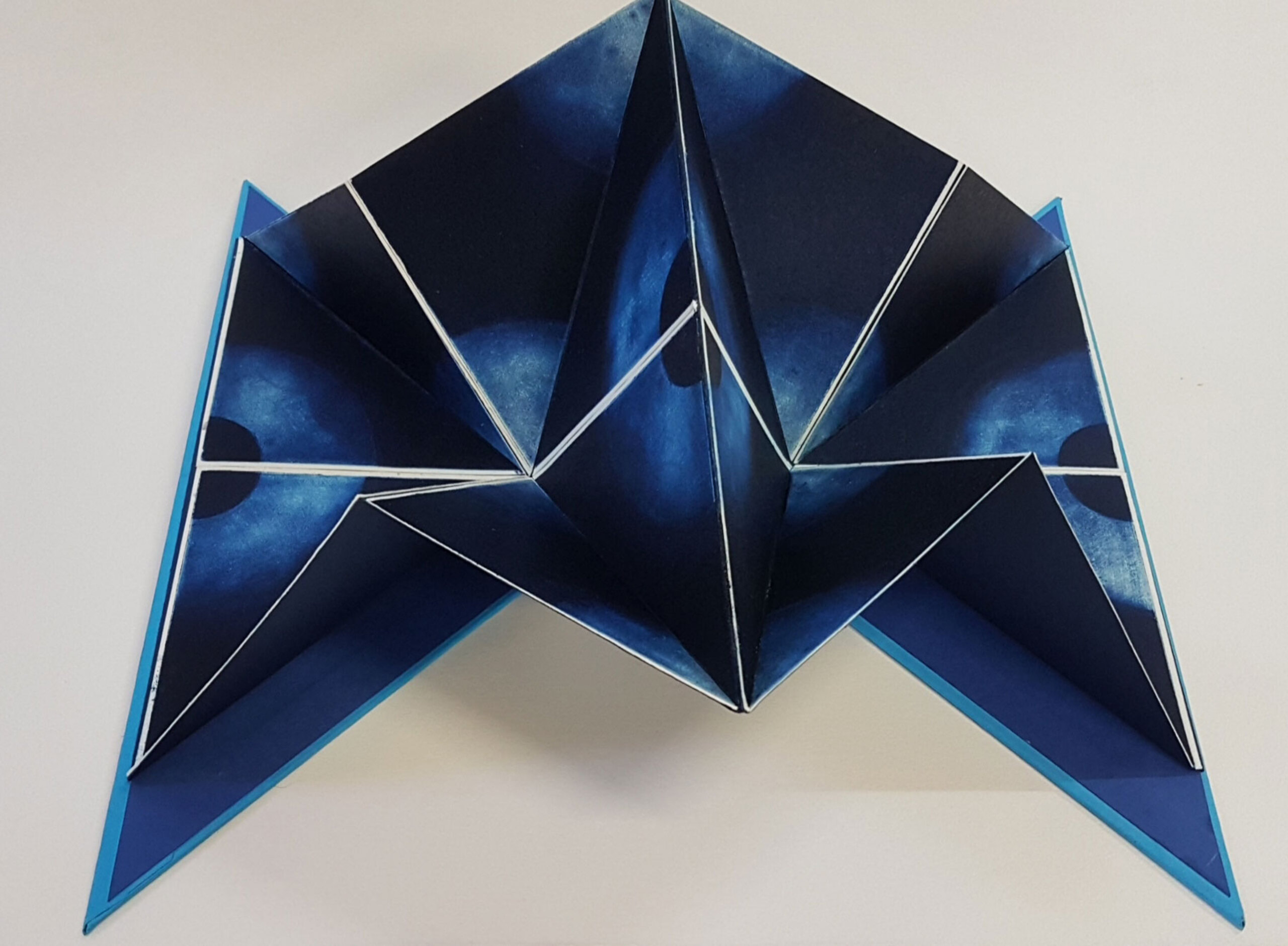 Nog een voorbeeld van een manier om dit boek uit te klappen bij dit kunstenaarsboek, gemaakt van speciaal hiervoor gedrukte mezzotinten. Gevouwen met de z.g. Turkse vouw en voorzien van een lichtblauwe kaft is dit boekje op veel verschillende manieren neer te zetten en te vouwen.Een manier om een derde dimensie in mijn werk te krijgen.