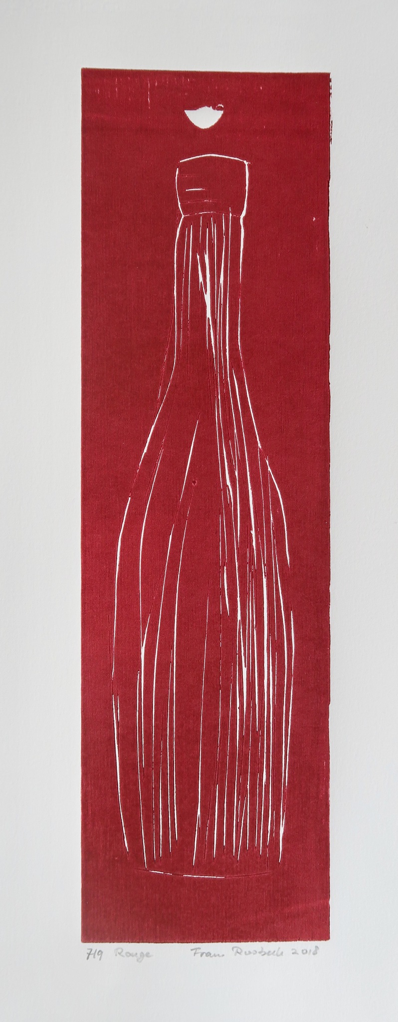 Een wijnfles zoals hij in een kist zou kunnen liggen. Techniek: houtsnede, gebruikmakend van het deksel van een wijnkist.