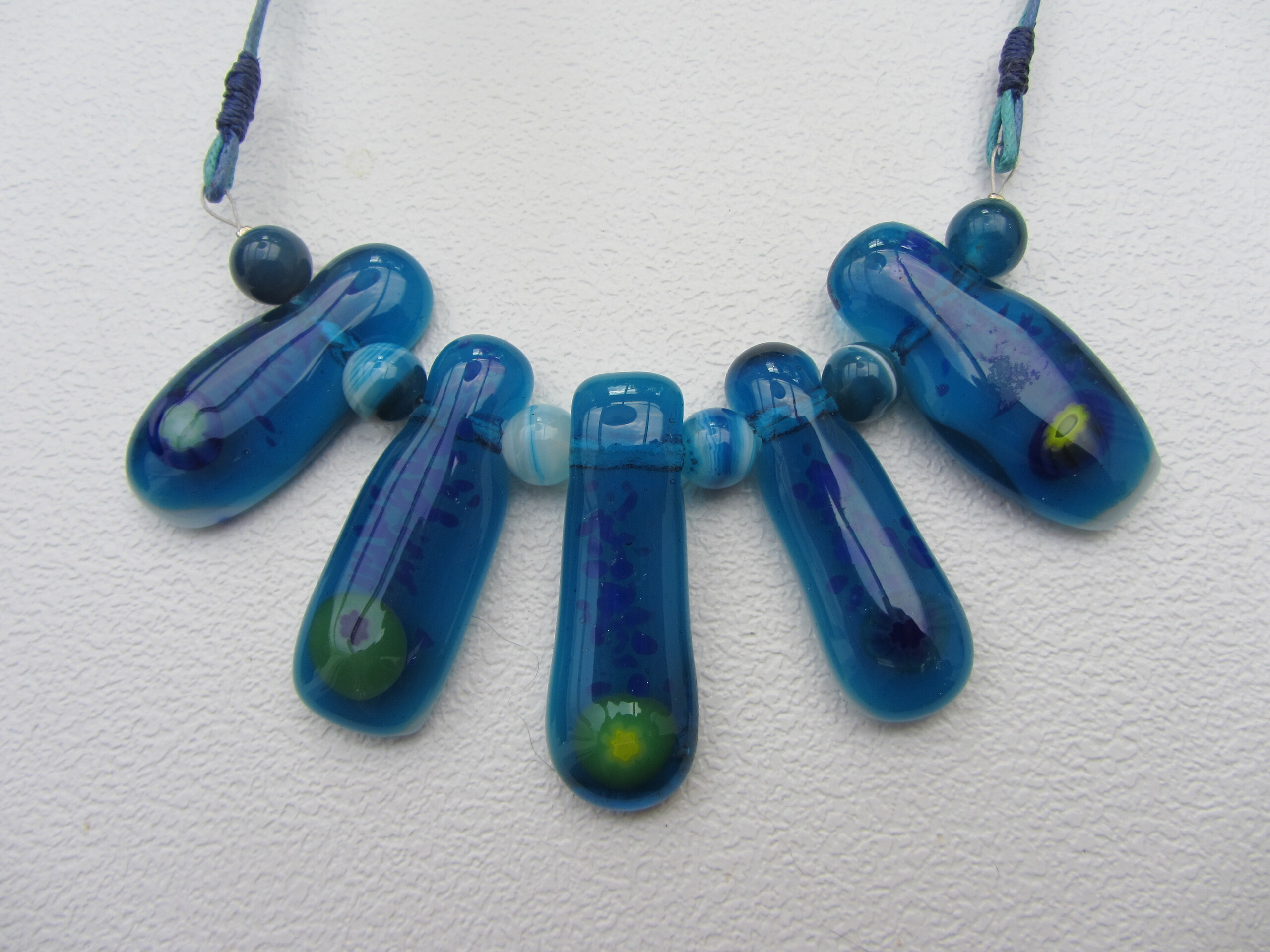 blauwe glassfusion ketting met chrysocolla kralen aan tweekleurige blauwe sueden veters.
