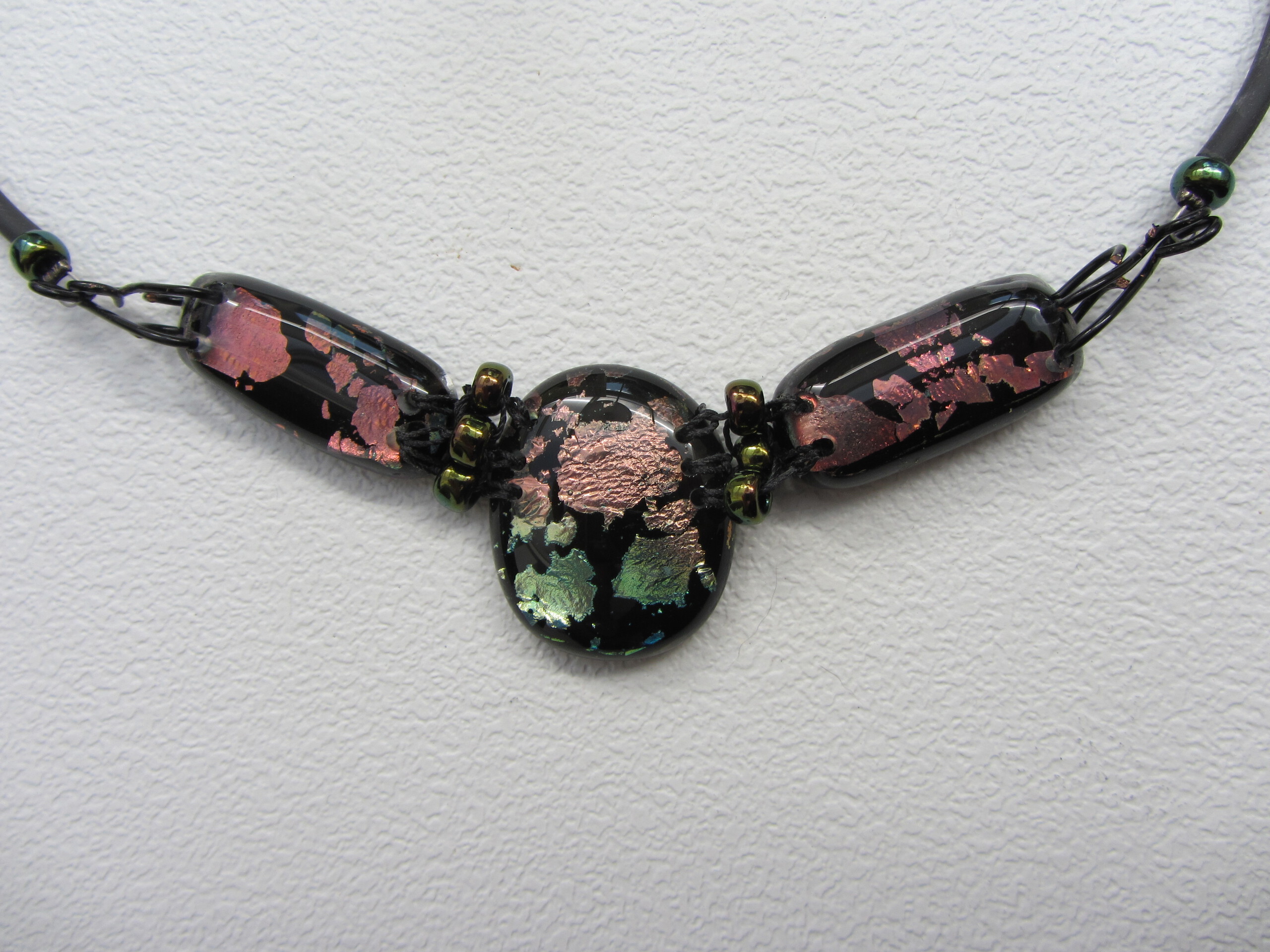 zwart met zalm/groene dichro aan elkaar geknoopt met kraaltjes. Aan een zwarte rubberen veter.