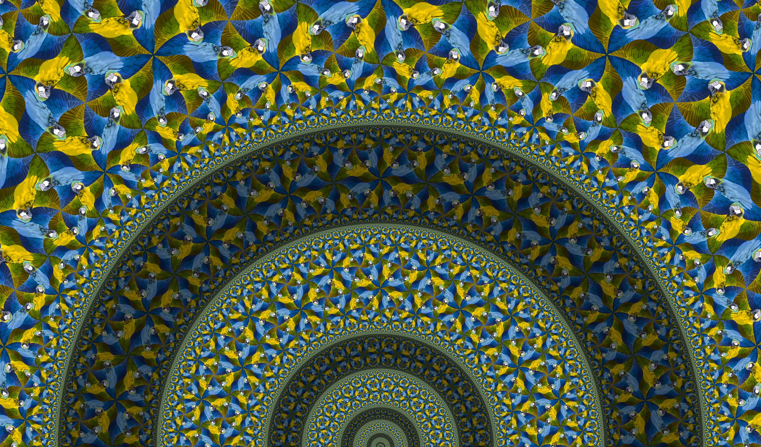 Deze bogen zijn afkomstig van papegaaien uit twee verschillende hyperbolische ruimtes, na transformatie via het bandmodel naar fractale cirkels. Vandaar dat de papegaaien in de lichtere bogen een ander patroon hebben als die in de donkere bogen. Dankzij de donkere bogen ontstaat een 3D-effect. Dit werk wordt afgedrukt als gallery-bond (tussen acrylglas en aluminium). Gelieve contact opnemen voor alternatieven.