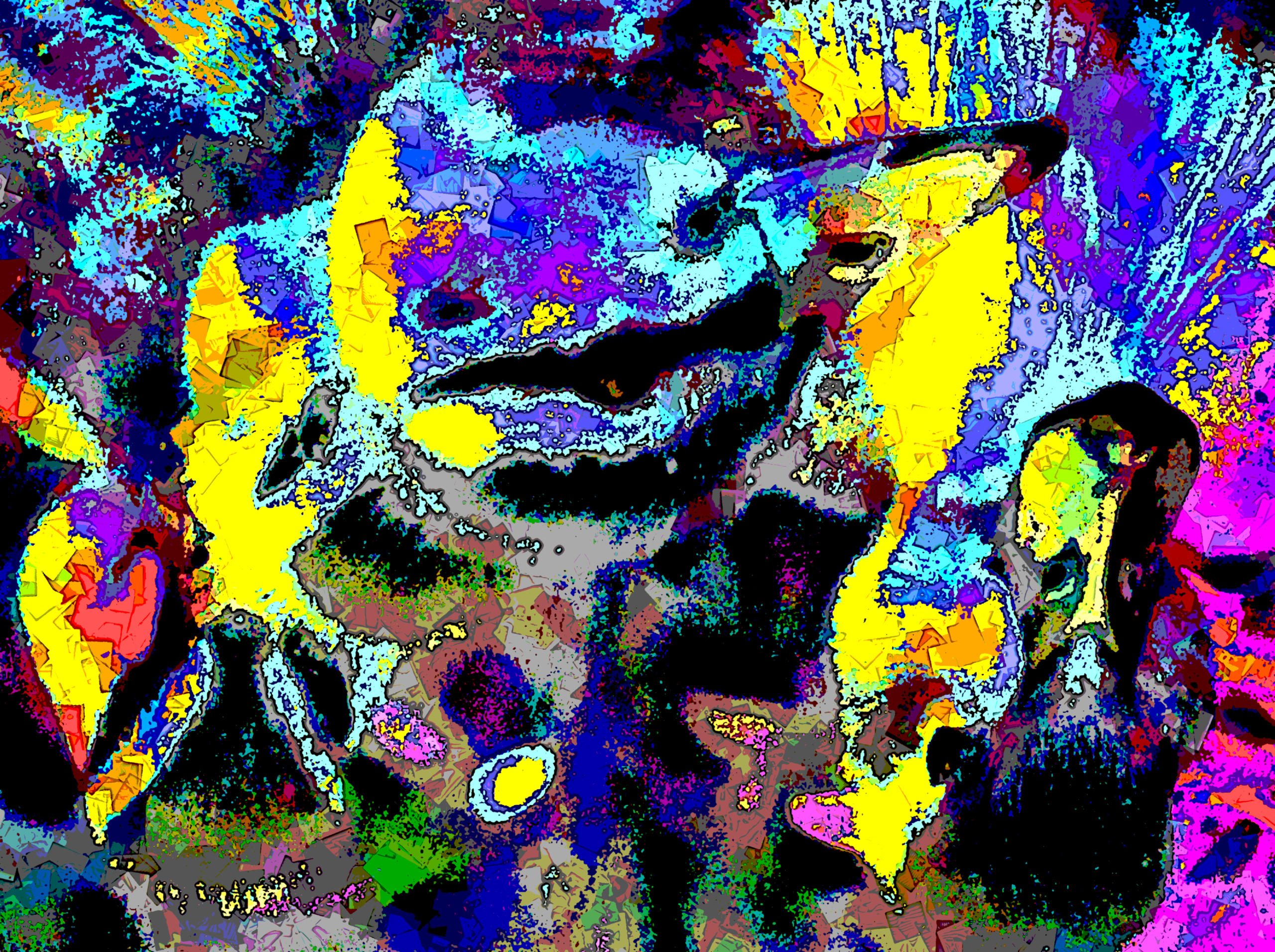 Abstract beeld van kwetterende eendenkuikens. Gebaseerd op een eigen opname die met diverse digitale technieken bewerkt is tot een abstract expressionistisch schilderij. Attentie: het werk wordt ingelijst geleverd. Zie voor meer info de pagina Levering.