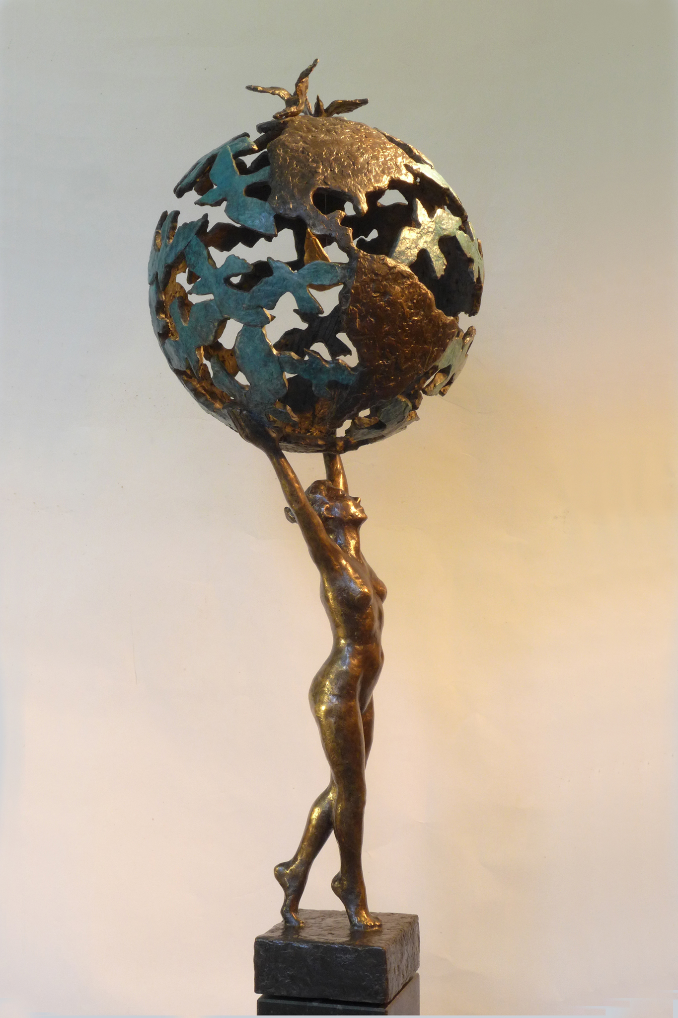 De vrouw draagt de aarde. In de wereldbol vliegt een gekooid vogeltje.Twee vrije vogels vliegen uit.