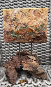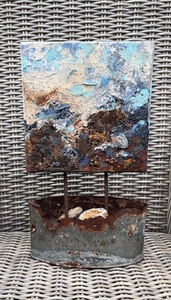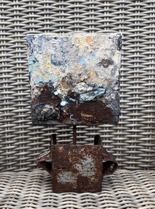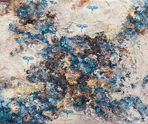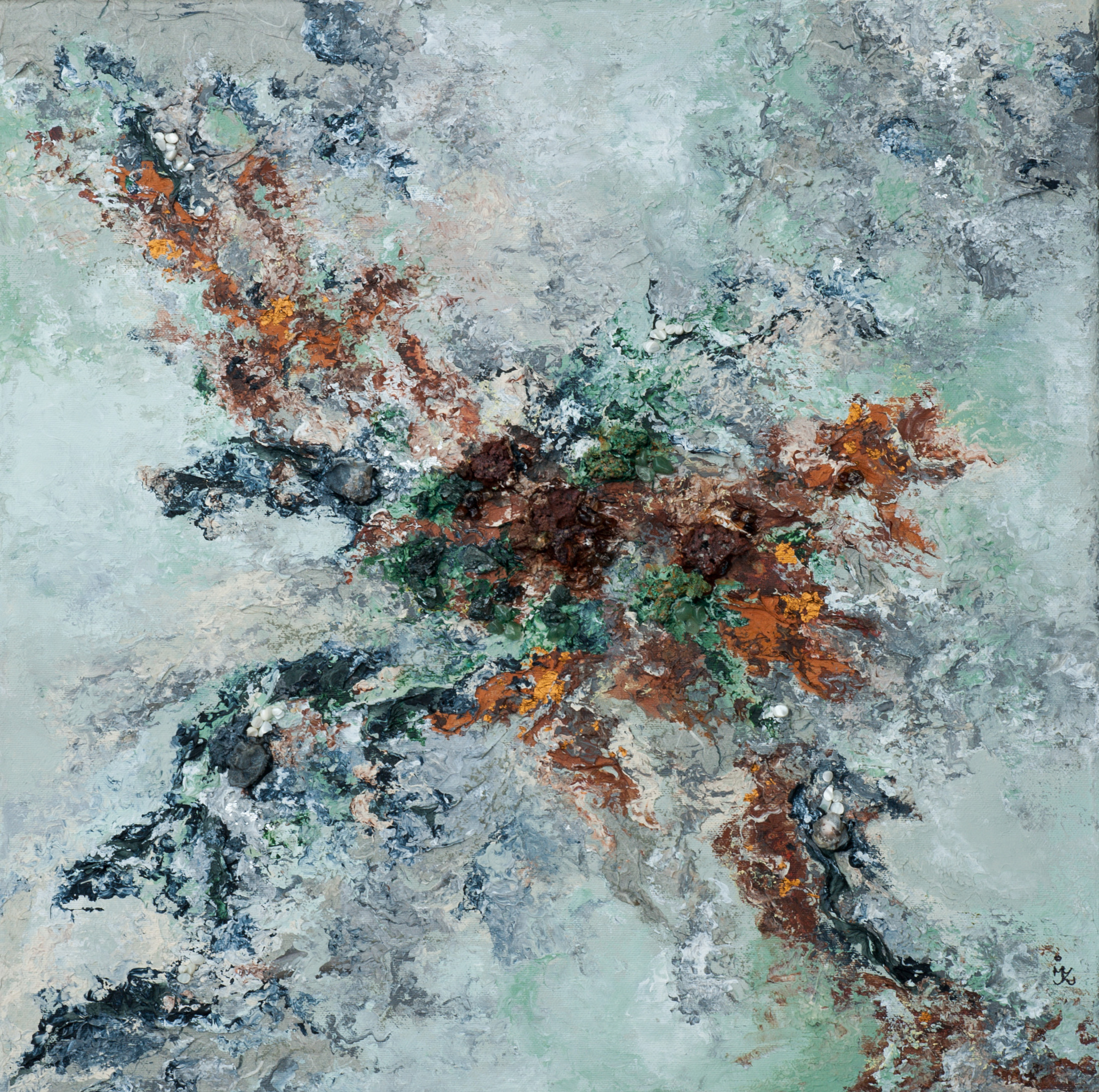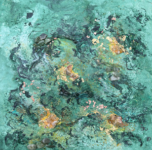 Acryl op doek, gemengde techniek met malachiet-koper, chalcedoon, zirkoon, aventurijn en siliciumcarbide carborundum.