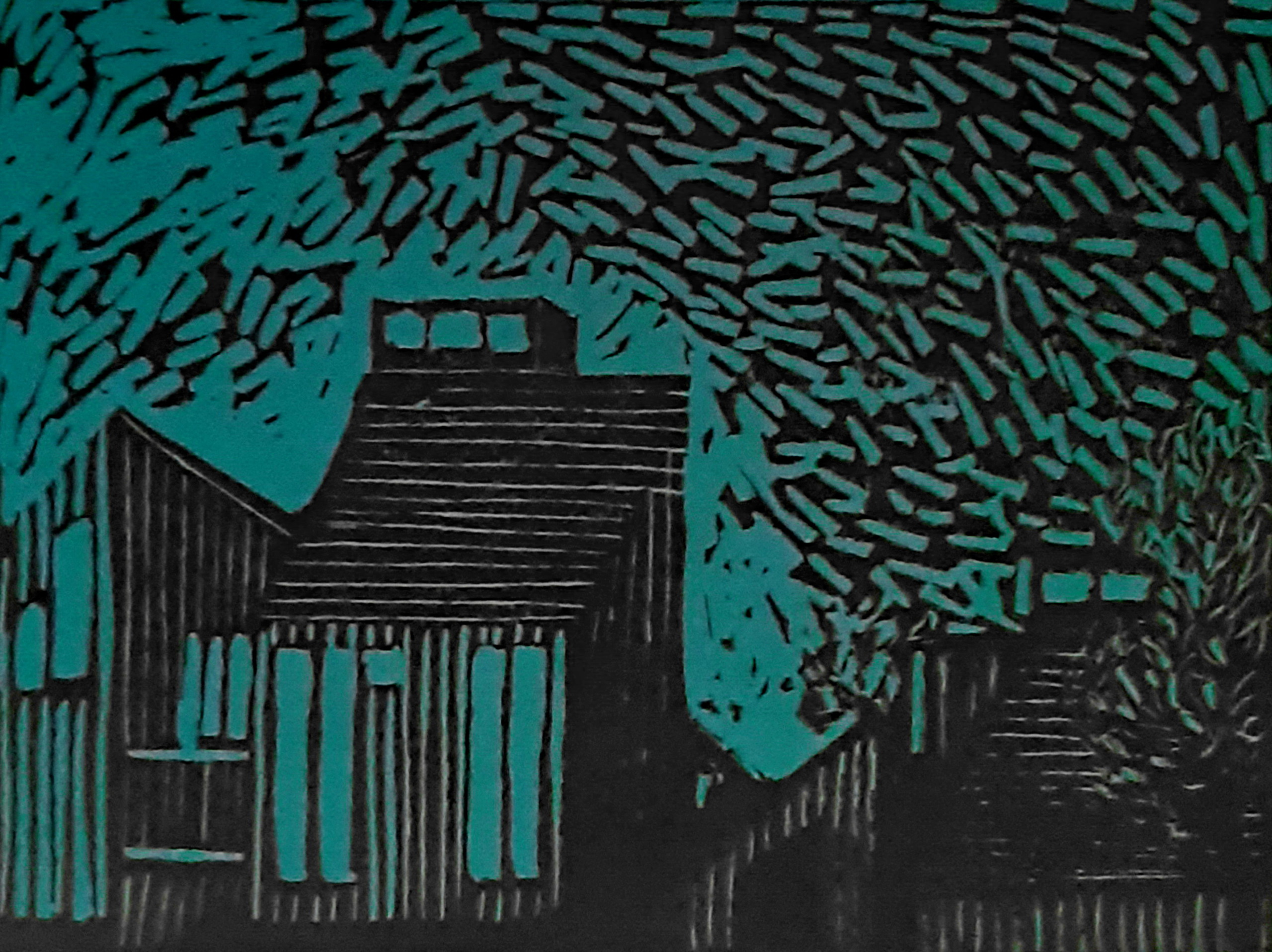 Studie van houten huizen in de buurt, nu op donkeblauw/groen papier