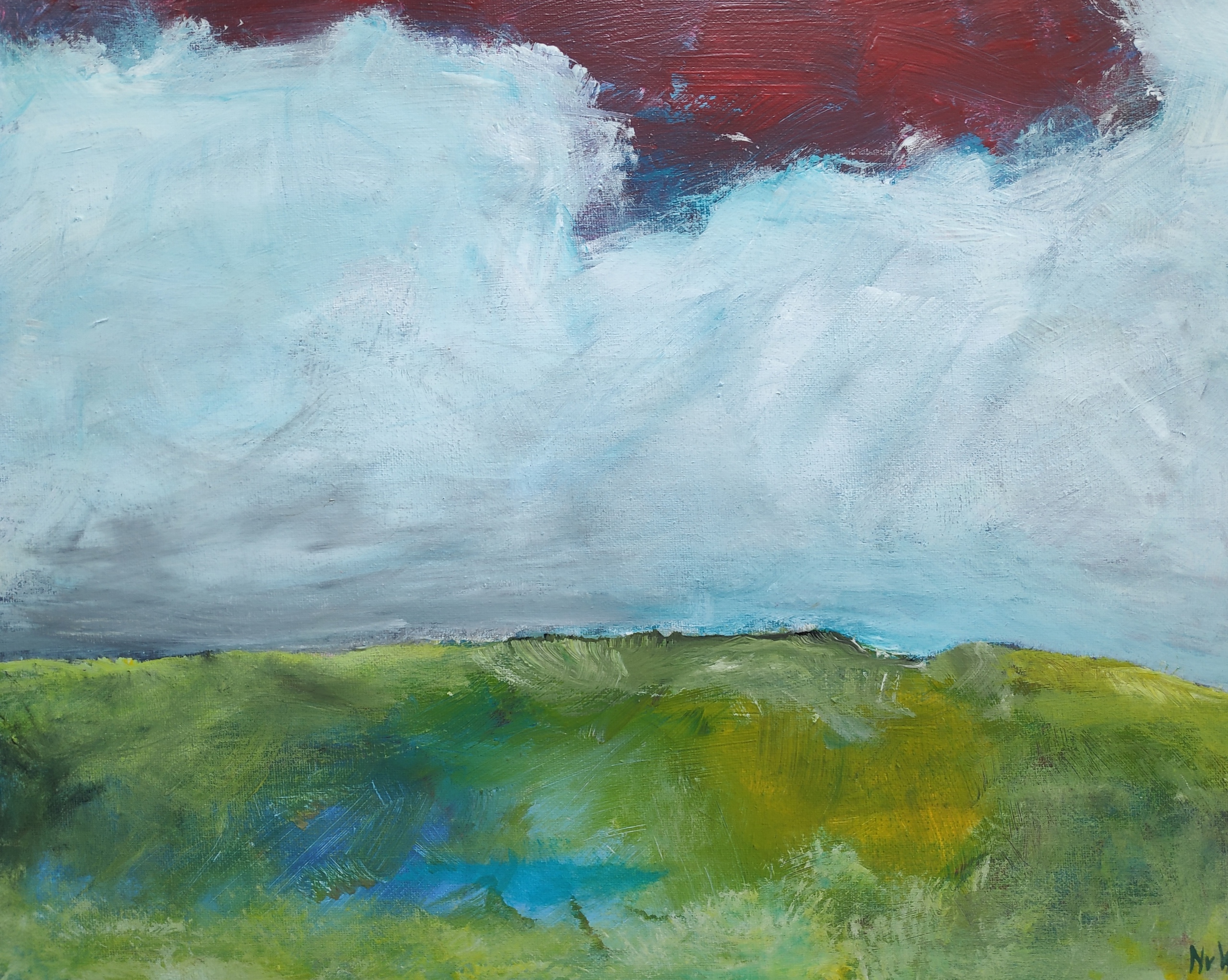 Landschap met rode hemel en wolkenpartij.