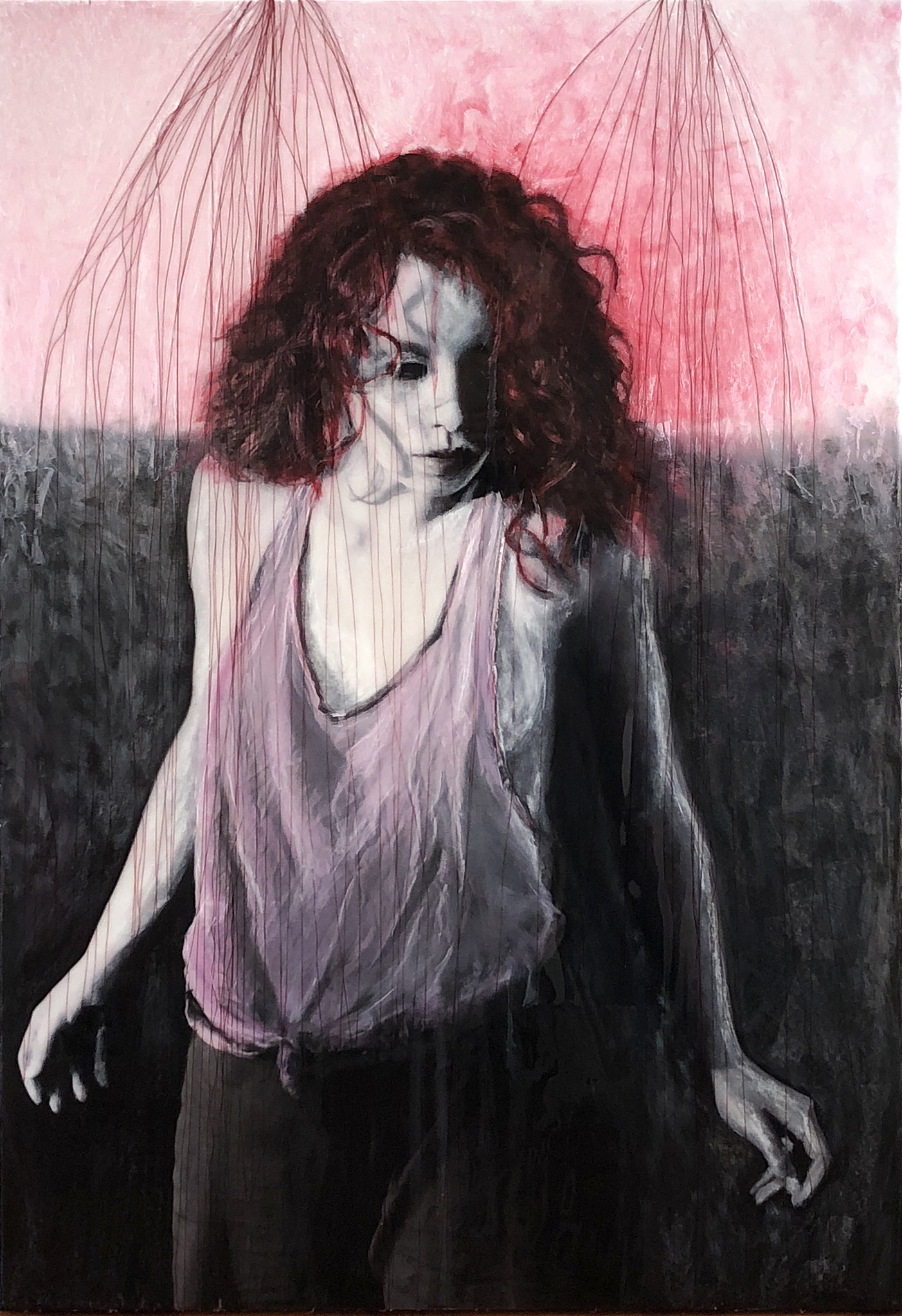 Meisje Rood Dans Vrouw Gevangen Roze Weiland Touw Alleen Kwetsbaar Vrij Zwartwit Draden Touwen Danser Roodharig Marionet Garen