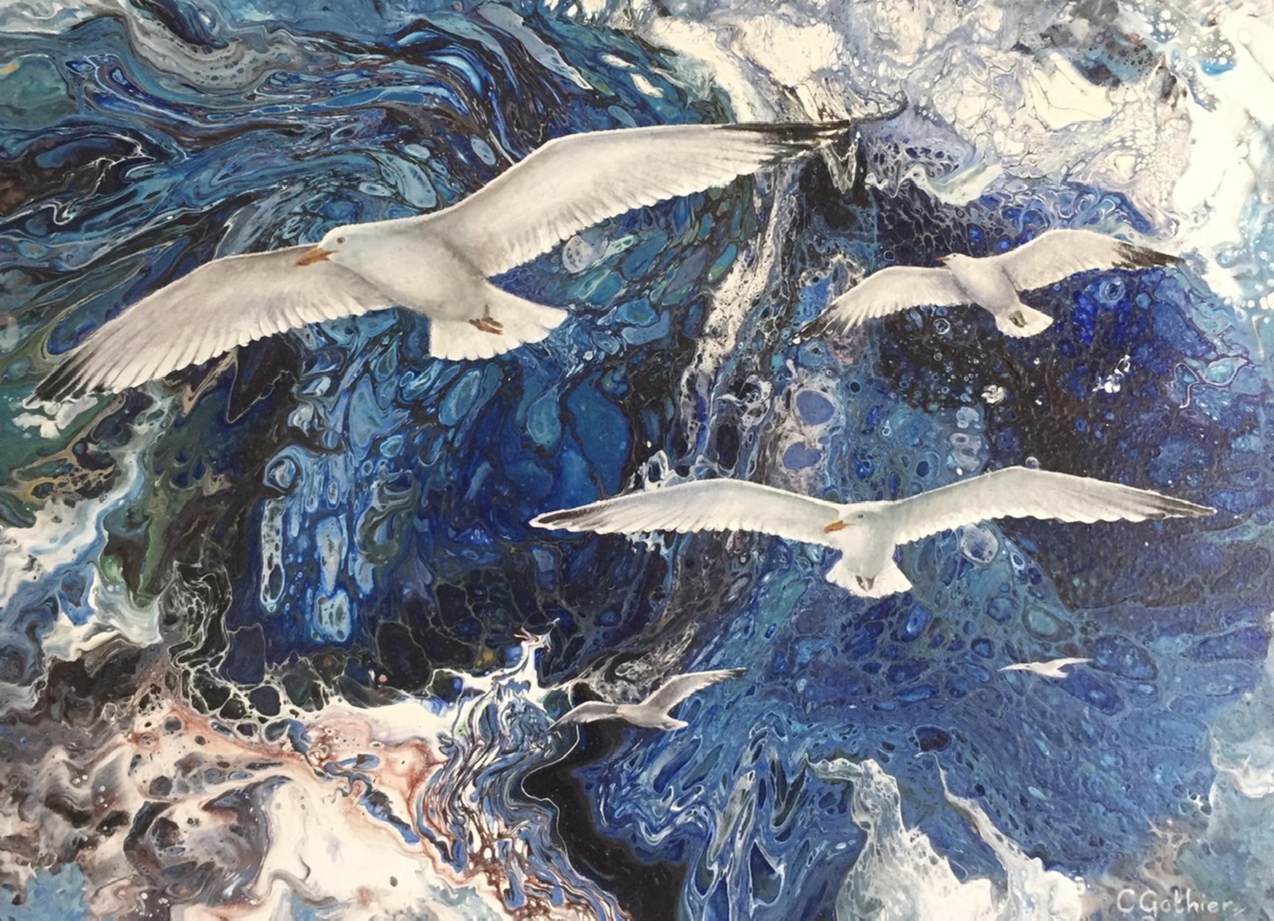 Deze vrij nieuwe techniek van gieten met vloeibare acryl verf heb ik gecombineerd met een meer realistische techniek. Dat resulteerde in een haast surrealistische voorstelling van deze meeuwen die de vrijheid tegemoet vliegen.