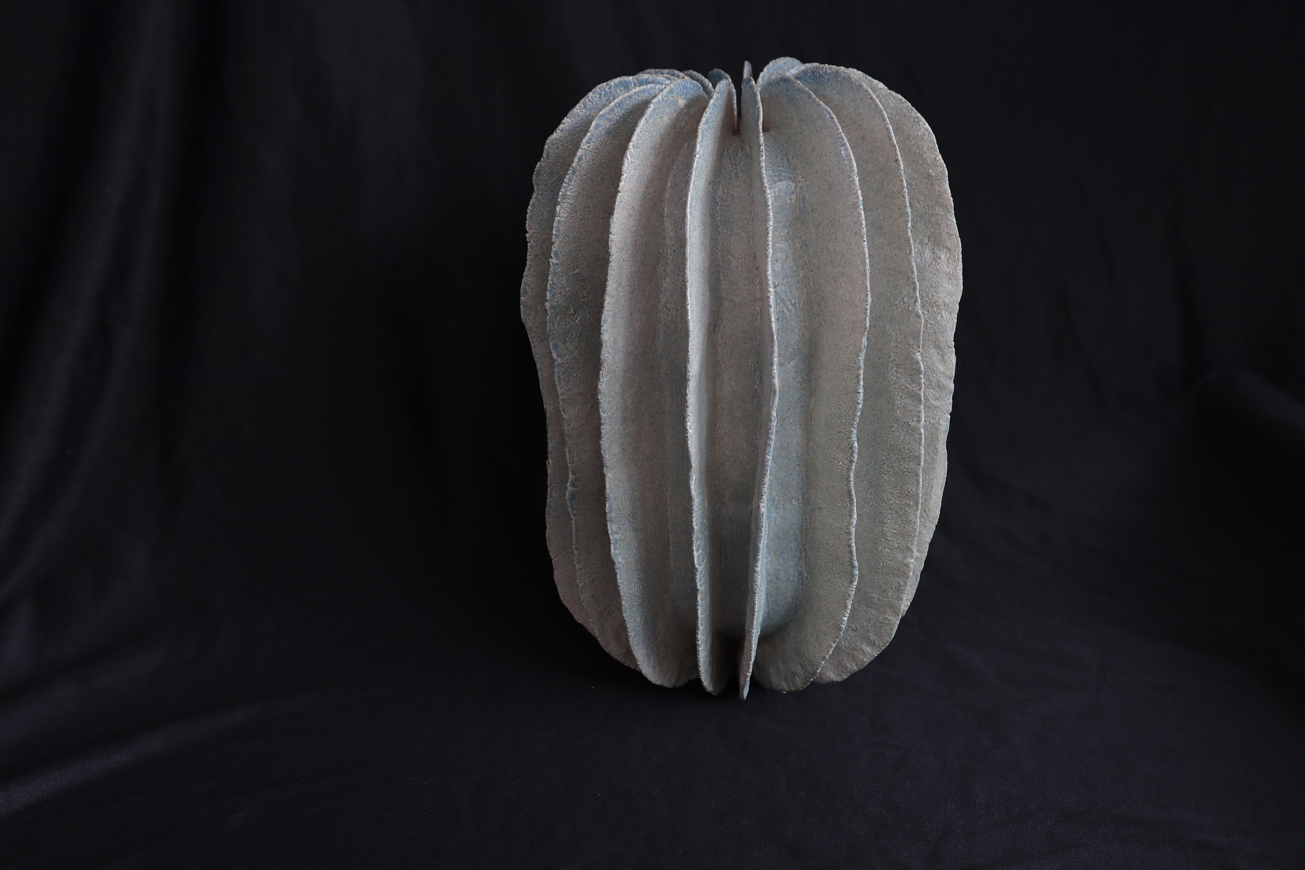 Deze koraal staat op haar baleinen en doet fragiel aan. Aan de binnenkant zit kleislib uit de Maas, bij Maasbommel. De kleur aan de buitenkant is een blauw/grijs mat glazuur.