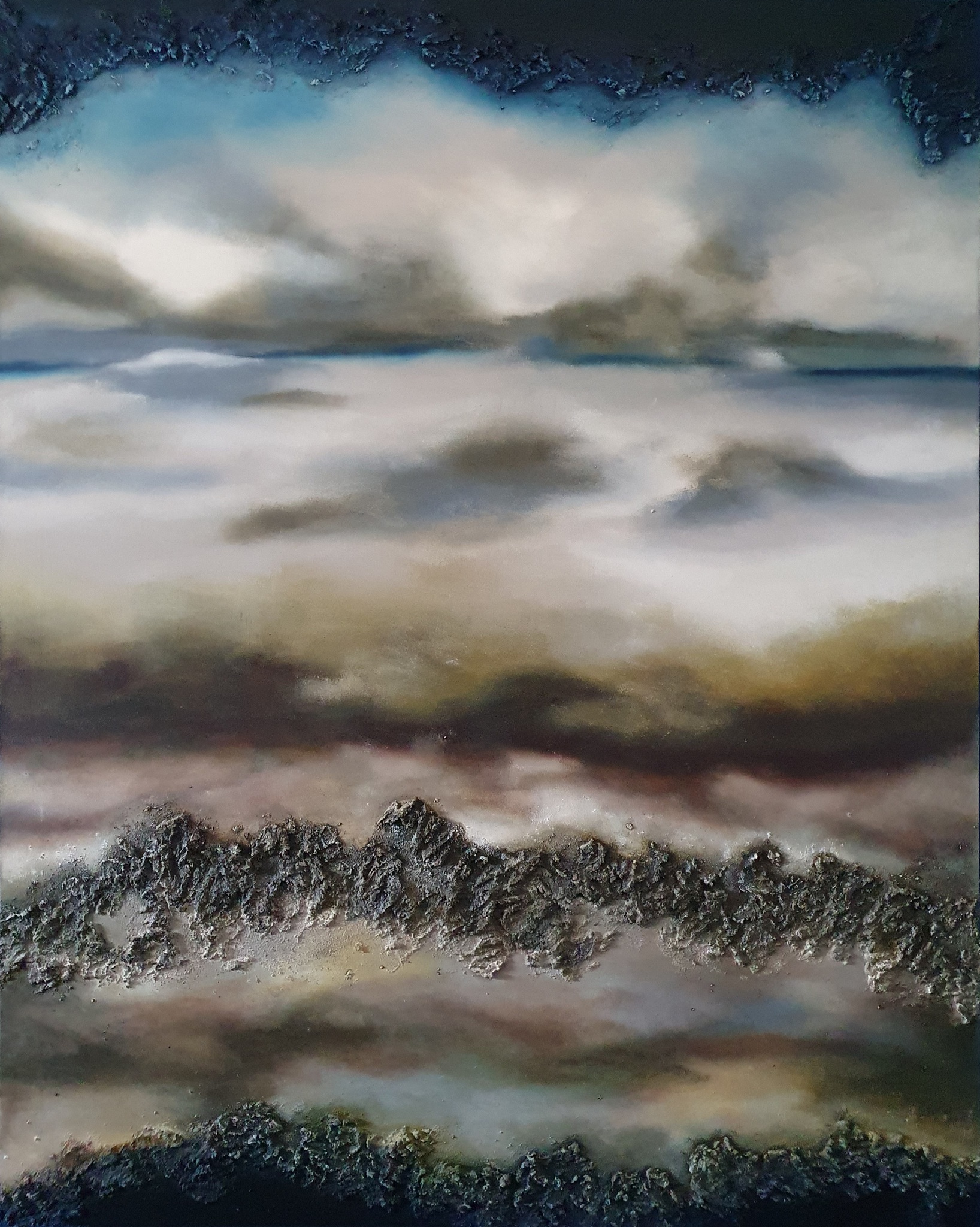 Groot abstract landschap van 150 x 120 x 4,5 cm. Gebruik gemaakt van gemengde techniek. De zijkanten van het doek zijn mee geschilderd. Intuïtief werk, het landschap is op het doek zelf ontstaan. Op het doek is een grove textuur aanwezig. Voor meer foto's kunt u kijken op www.reneetencate.nl