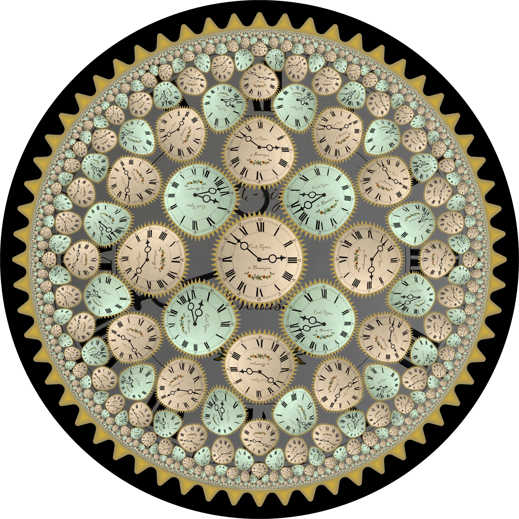 Twee instanties van de klok Cent Vignes de Beauséjour grijpen in de hyperbolische ruimte in elkaar via tandwielen. Een oranje klok grenst aan vier groene klokken, en een groene klok aan vijf oranje klokken. Dit patroon staat bekend als “truncated order-5 square tiling”, en is zo geconfigureerd dat de groene klok en de oranje klok gelijke grootte hebben in de normale (Euclidische) ruimte. De ronde schijf wordt afgedrukt als gallery-bond (tussen acrylglas en aluminium).