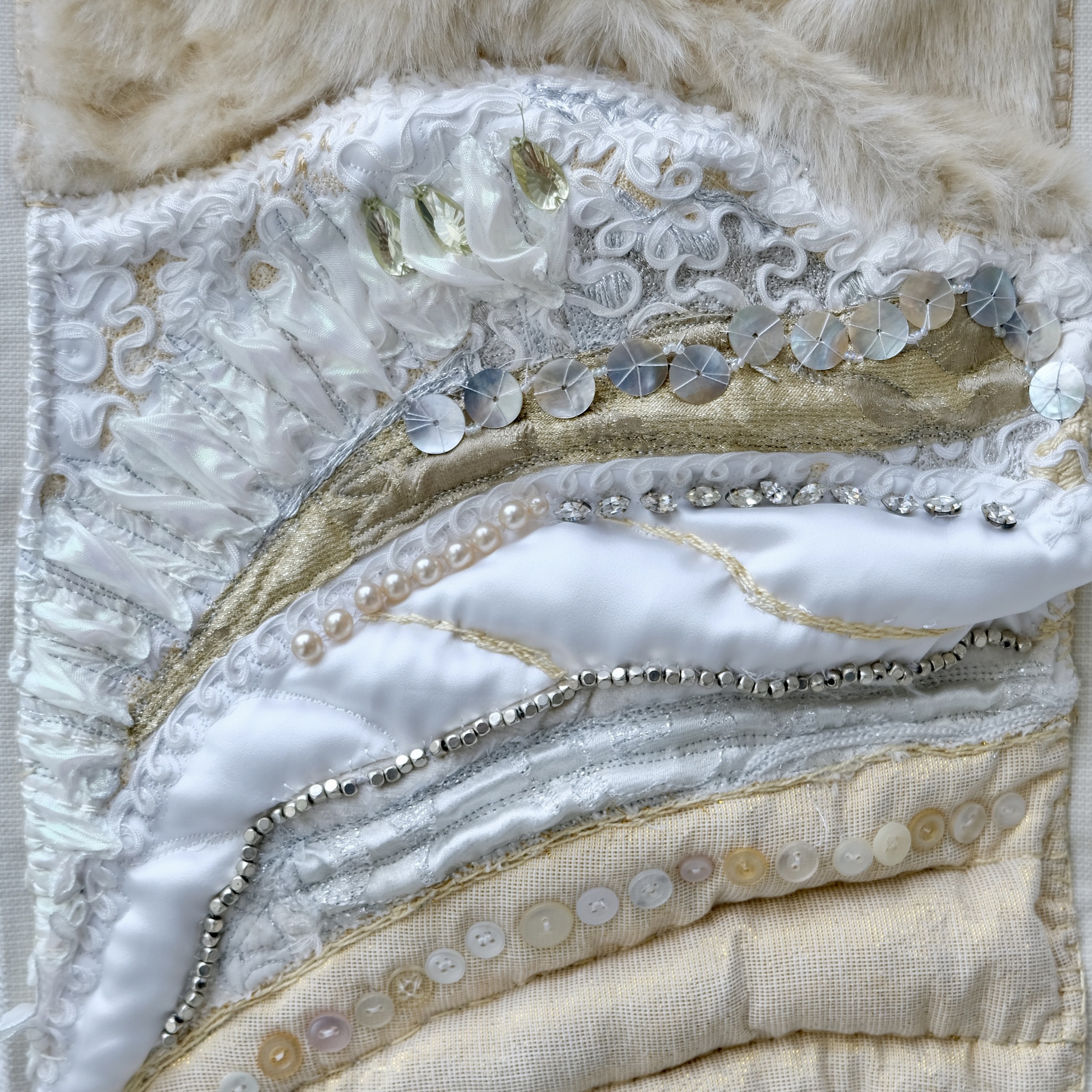 Dubbele kaart (15x15 cm met envelope). Detail van witte antependium (voor kerkelijke feestdagen, huwelijk, geboorte..). Rimpelingen in stoffen.