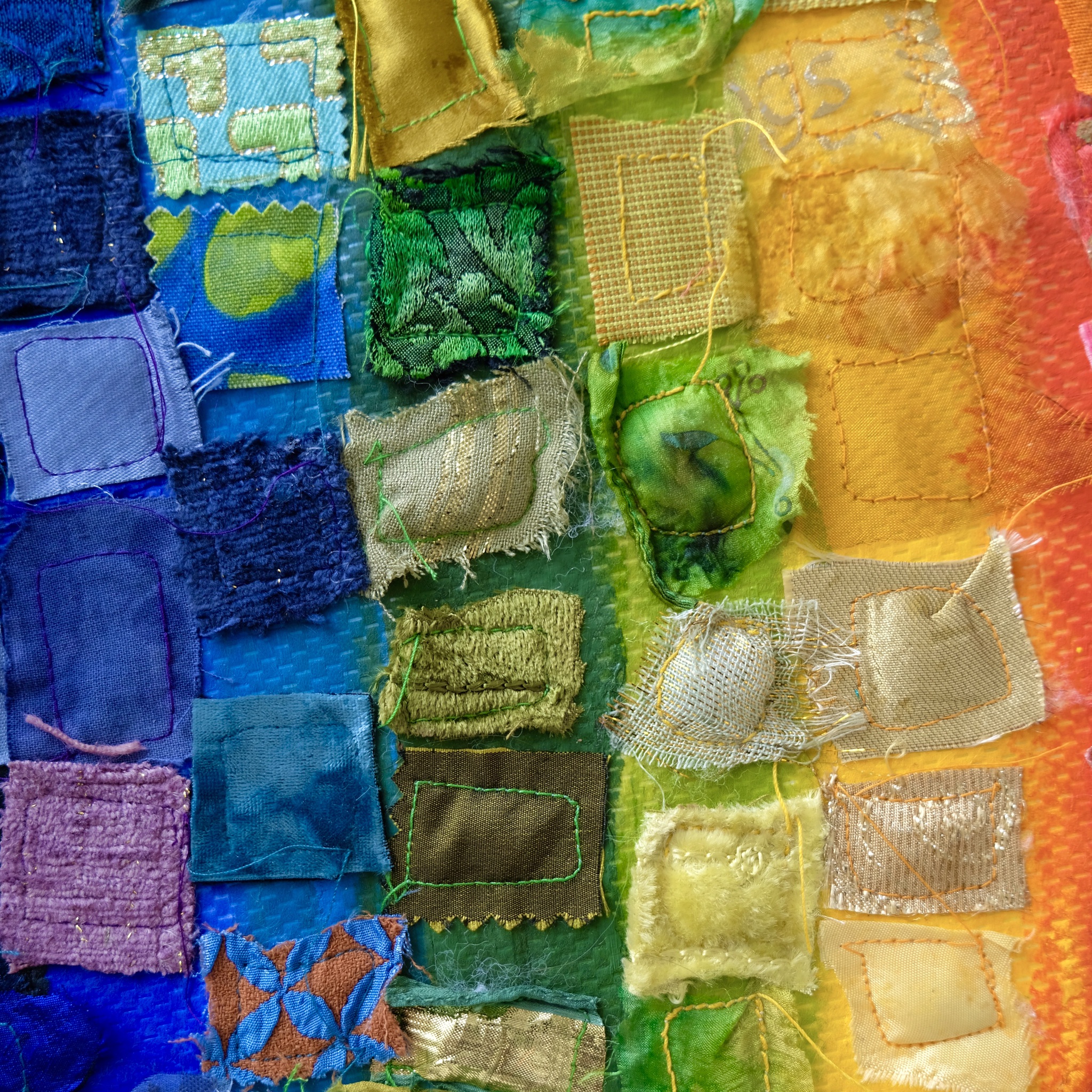 Dubbele kaart (15x15 cm met envelope). Detail van regenboog in textiel, symbool voor de veelkleurigheid van mensen