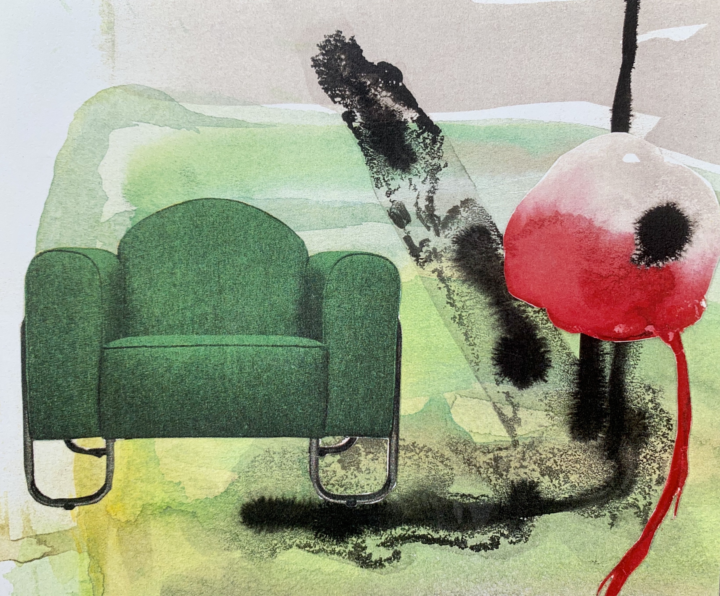 Gemengde technieken op papier. Collage, inkt en aquarel. Groen en rood.