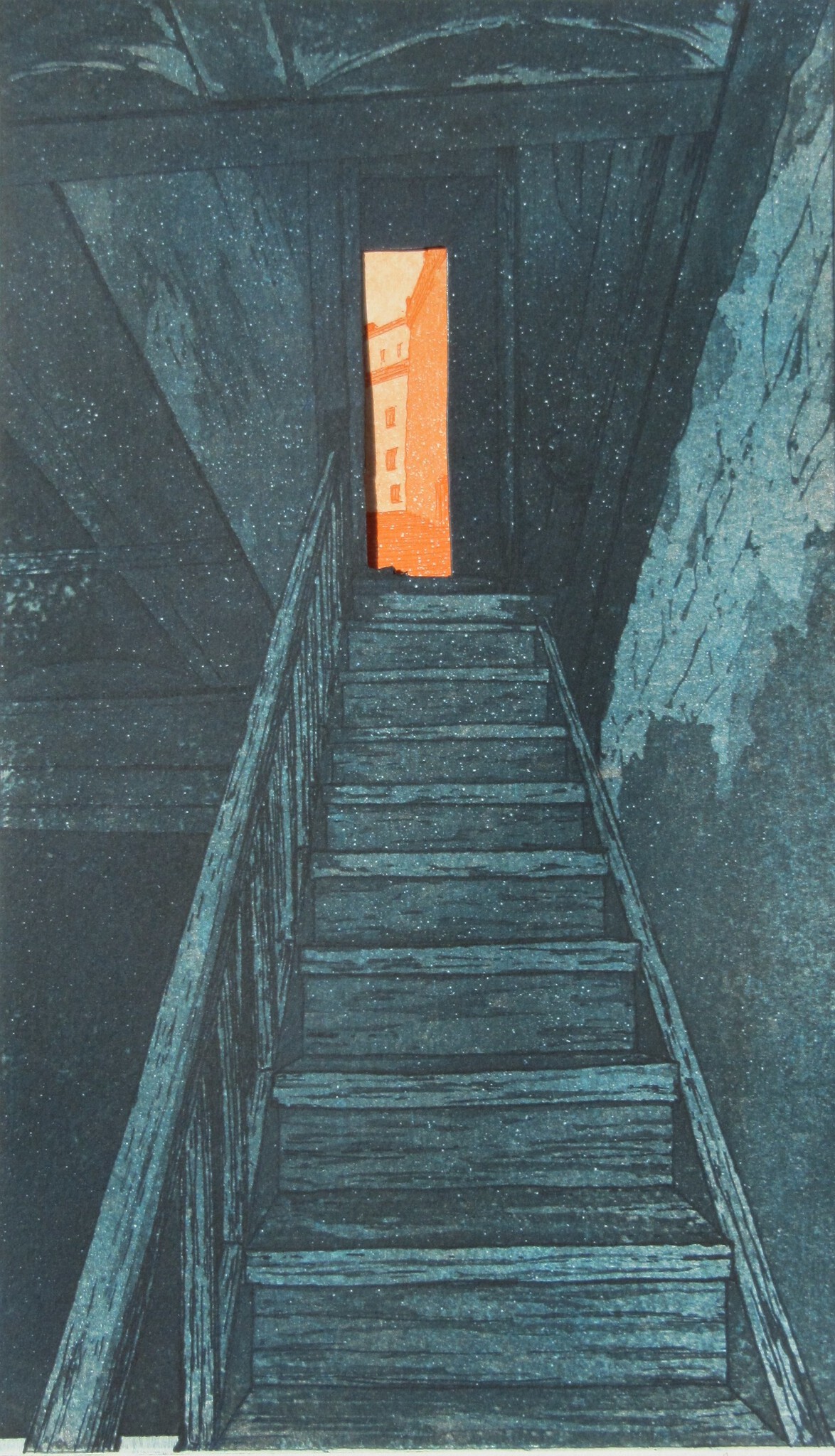 "Naar de houtsnipper zolder + Rome". Dit is een collage van twee etsen. De oorspronkelijke "opp til flisloftet" en "Roma" uit 1994. De houtsnipper zolder ets is gemaakt i.v.m. een tentoonstelling in Klevfos Industrimuseet. Een voormalige papierfabriek wat nu een industrie museum is i Løten, Noorwegen.