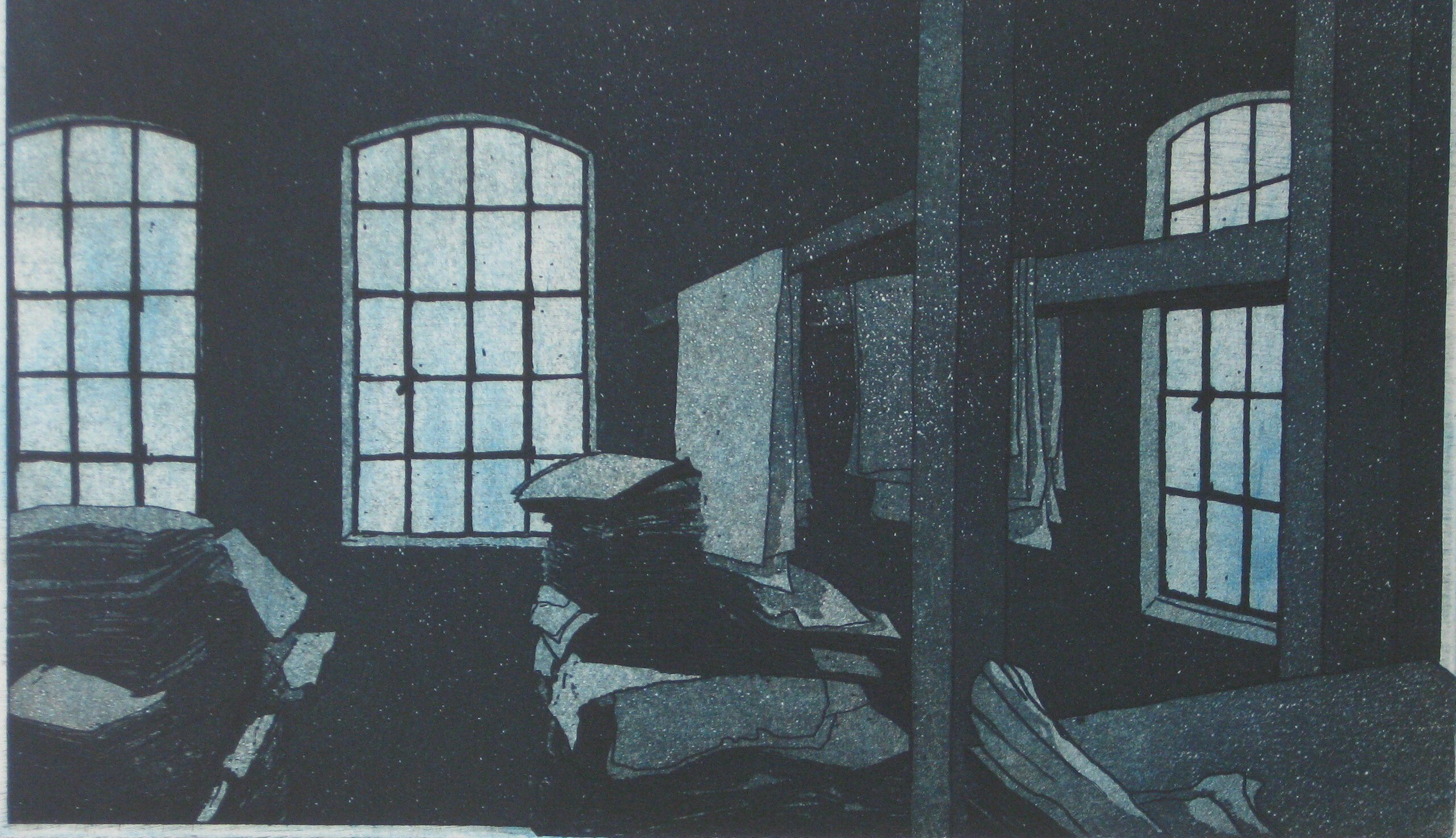 Pakkeri Klevfos. Inpak avdeling van de oude papier fabriek Klevfos, Løten, Noorwegen. De ets is gemaakt i.v.m. een tentoonstelling in de fabriek, nu Industri Museum Klevfos.