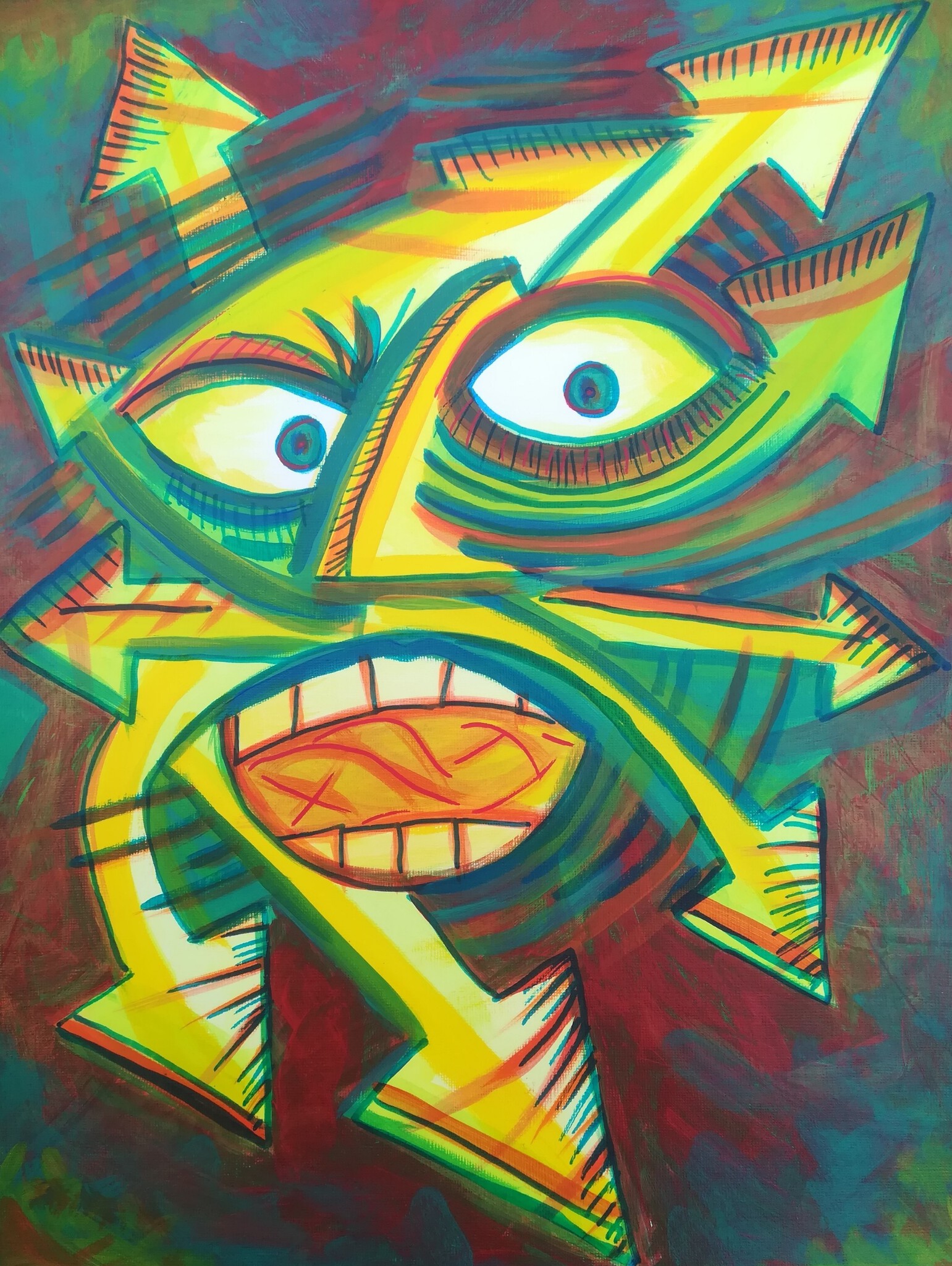 Schilderij met uitbeeldend gezicht.woede agressie. Felle kleuren. Acryl verf op papier.