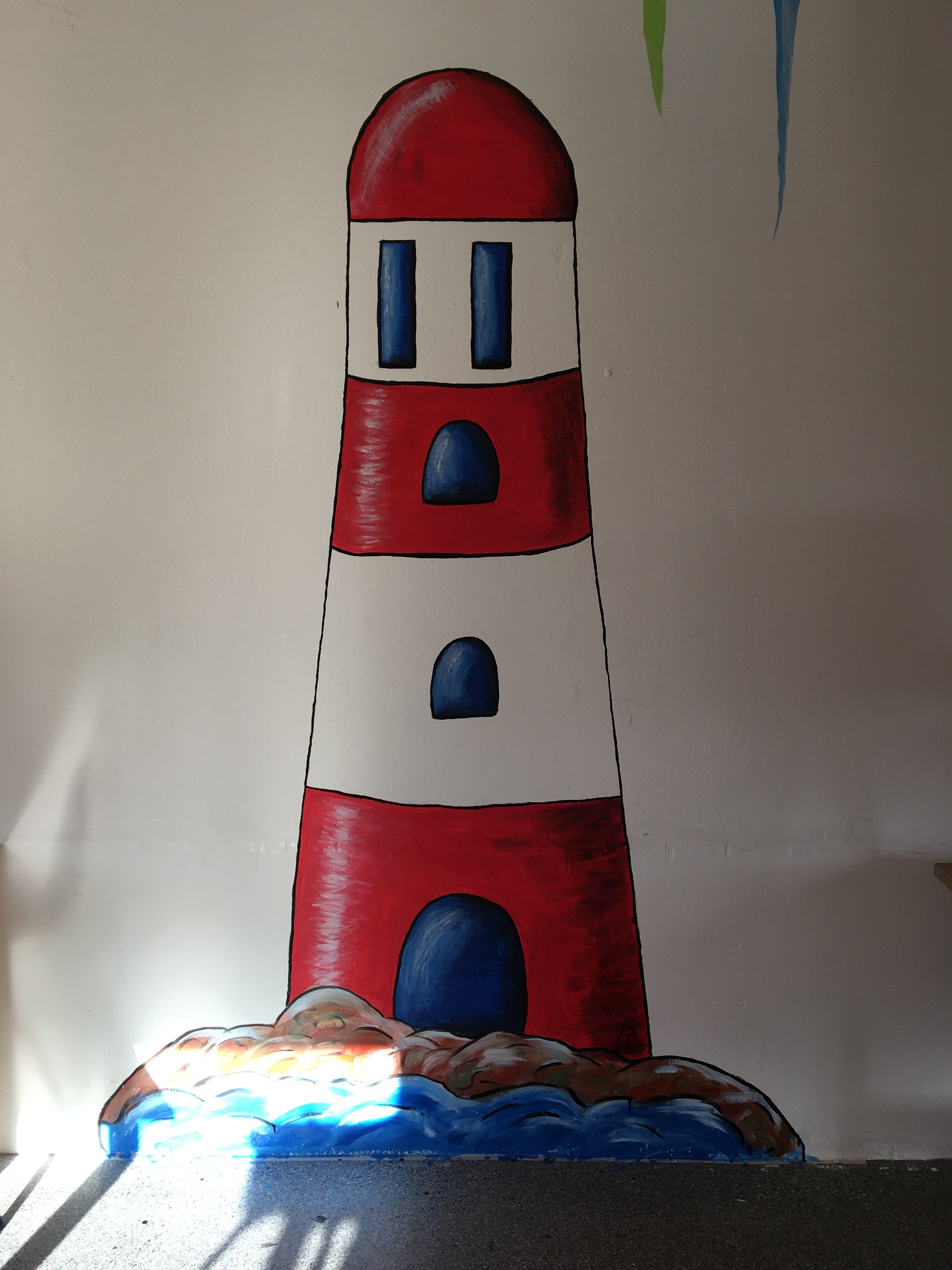 *Deze vuurtoren heb ik gemaakt voor een kinderdagverblijf. *Deze muurschildering is met acrylverf en penseel opgebracht. *De muurschildering heeft de letter R (van Renate) rechts onderin.