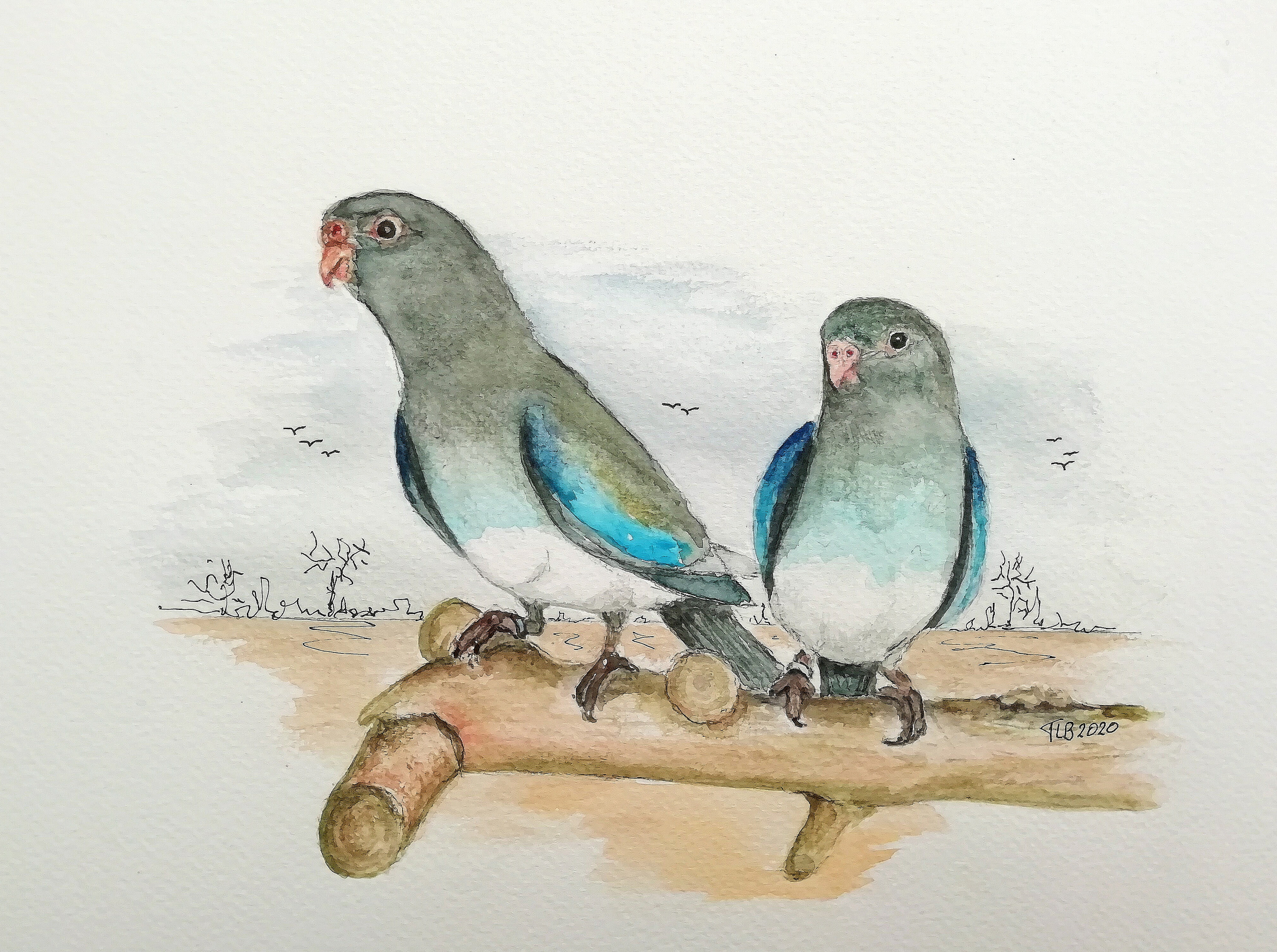 Twee jonge Splendid parkieten (Blauwe witbuik)