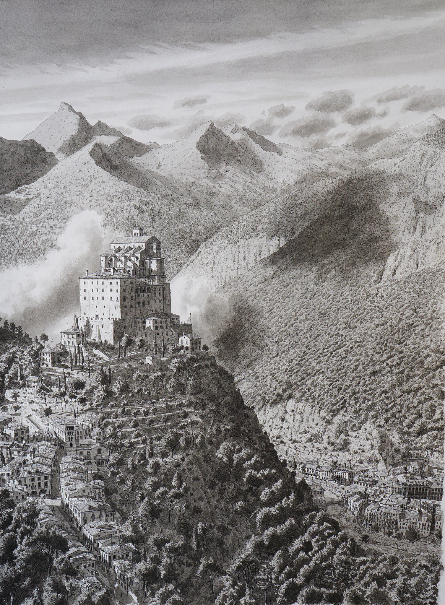 Landschap Art Tekening Kunst Bergen Landscape Kerk Drawing Realisme Realism Architectuur Architecture Church Mountains Klooster Monastery