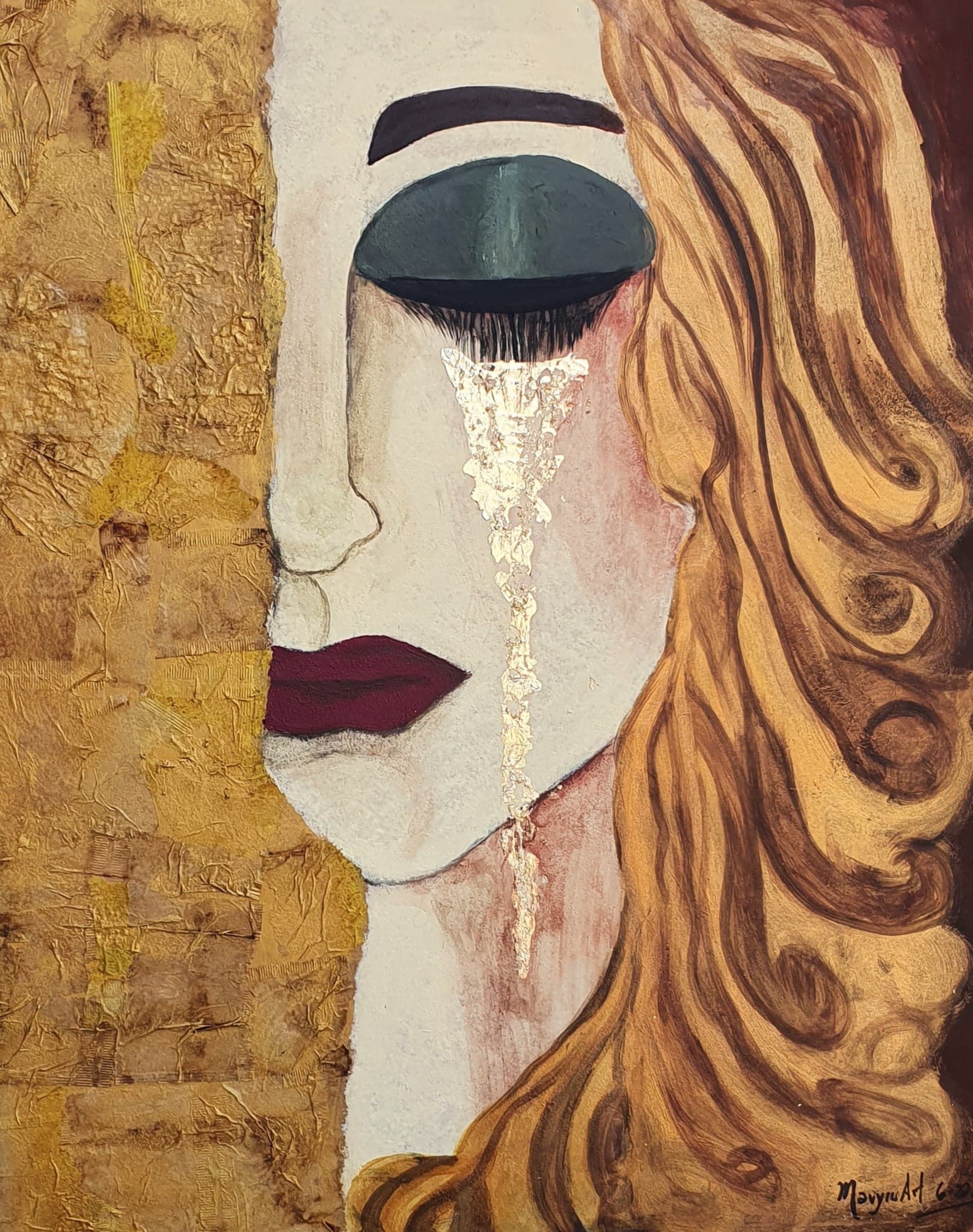 Een interpretatie van Lacrimas de Freyas, met gebruikte theezakjes en acryl..Anne Marie was een vriendin van Gustav Klimt, wat ook duidelijk te zien is in haar werk.