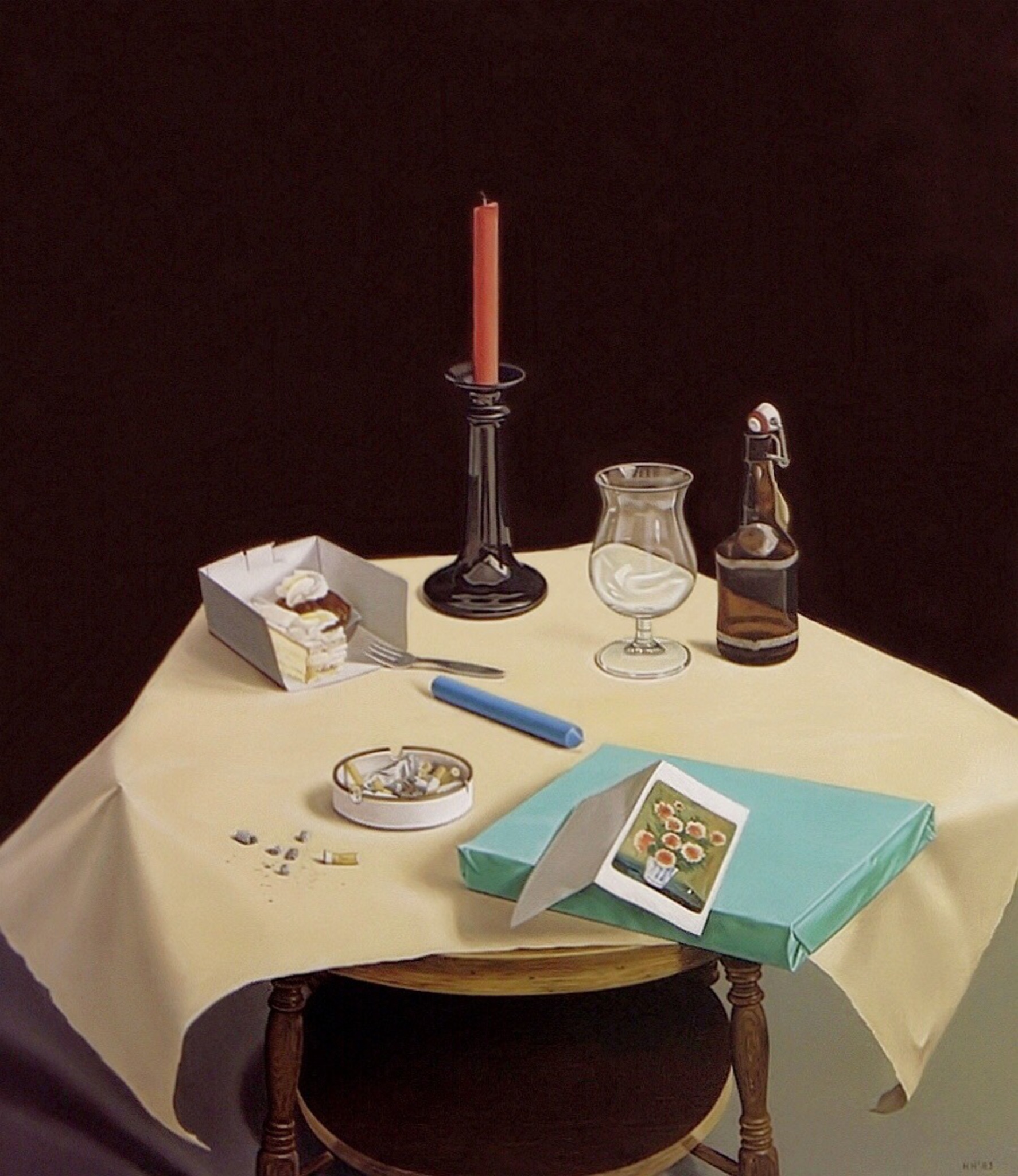 Kunst Schilderij Schilderijen Olieverf Stilleven Stillevens In Interieur Atelier Realistisch Realistische Fijngeschilderd Fijnschilder Verjaardag Gebak Bier Bierglas Glas Verjaardagscadeau Kandelaar Kaars