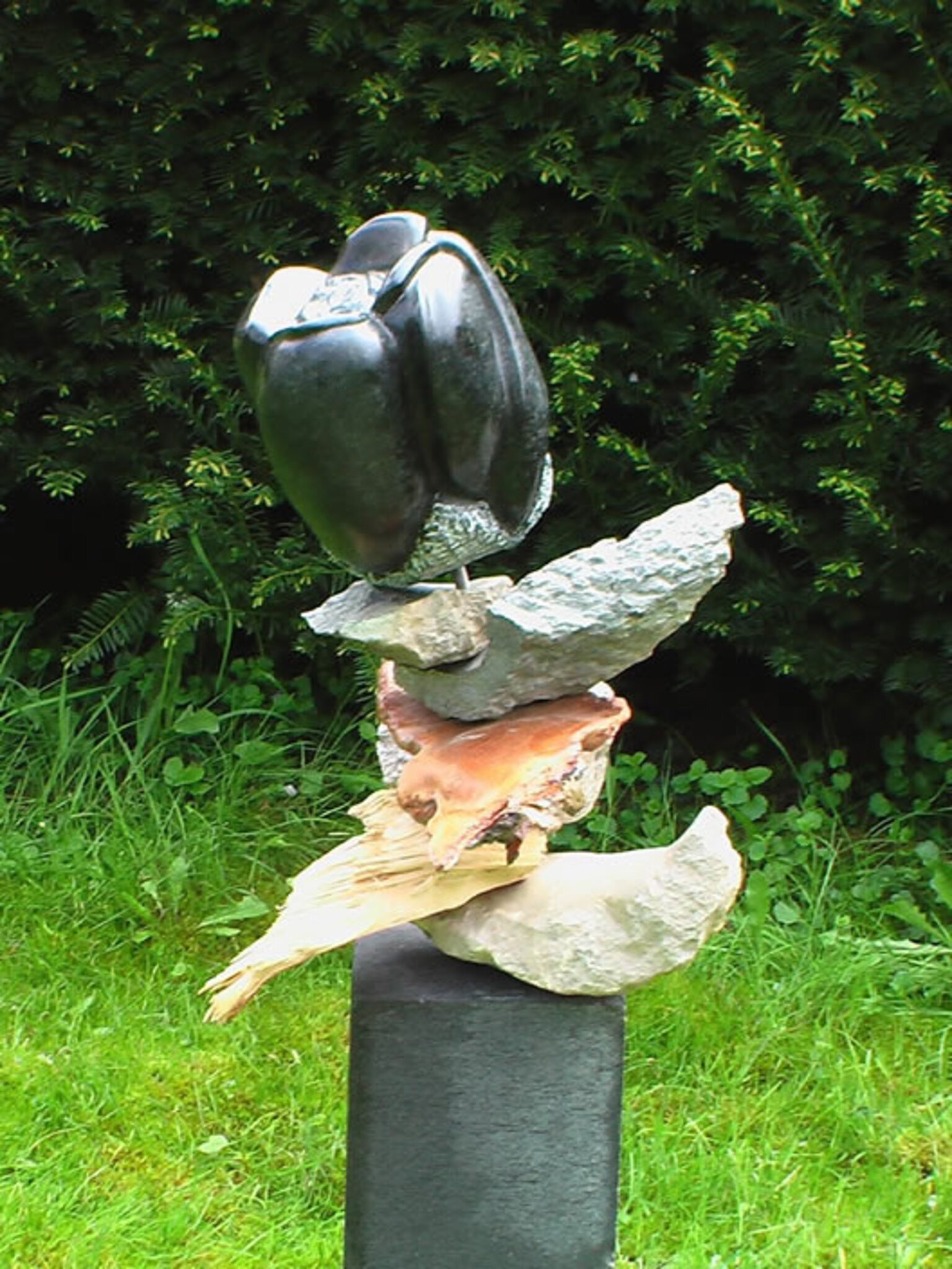 Donkere Bloemknop met bladeren Materiaal: Springstone bloemknop en Bladeren in fruitserpentijn + spotted opal bladeren Maten: sokkel afm. h 45 cm, br. 15 x 14,5 cm Gewicht: 13 + 24 kg De Bloemknop is gemaakt van een Springstone en de Bladeren zijn andere serpentijnstenen. De bloemknop is figuratief, gepolijst en hebben aan de onderzijde blaadjes met beitelsporen voor contrast met de bloemblaadjes. De Bladeren zijn bijna abstract/organisch en ten dele bewerkt en en ten dele gepolijst, een ander deel is ruwe steen gelaten voor het contrast en om de mooie kleuren van de stenen te laten zien. Aan de bloemknop ben ik erg lang bezig geweest, springstone is erg hard, het heeft de hardheid van marmer. Het is een tijdloos beeld. Dark Flowerbud with leaves Material: Springstone Flower Bud + Leaves in fruitserpentine + spotted opal Sizes: sokkel afm. h 45 cm, br. 15 x 14,5 cm - weight: 13 + 24 kg Notice: The Flower Bud is made from a Springstone and the Leaves are other serpentine stones. The Flower Bud is figurative, polished and has leaves with chisel marks on the underside for contrast with the petals. The Leaves are almost abstract / organic and partly worked and and partly polished, another part is left raw stone for contrast and to show the beautiful colors of the stones. It took me a long time to work on the flower bud, springstone is very hard, it has the hardness of marble. It's a timeless sculpture.