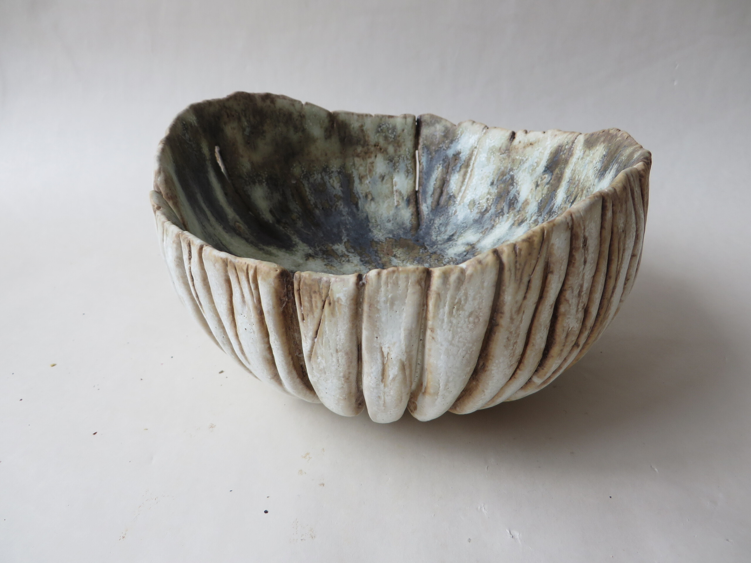 Omhoog gekrulde paddenstoelkop. Steengoed, glazuren.