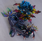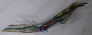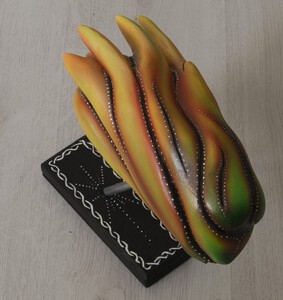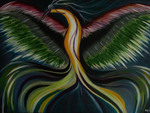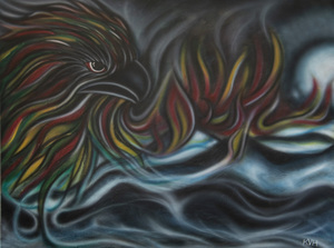 Water en vuur is een toepasselijke naam voor dit schilderij. Na vele pogingen om het tot een goed eindresultaat te maken, kwam het moment dat het een enkeltje vuilbalk zal krijgen, steeds dichterbij. Met enige passie werd dit werkje naar de stoffige zolder verbannen, waar het meer dan een half jaar heeft gestaan. Tijdens het opruimen van de zolder kwam ik het weer tegen en zag er een uitdaging in om het alsnog tot een geslaagd project te maken. Tijdens het werken aan dit schilderij, dreven een paar fikse onweersbuien over, waaruit het idee ontstond om onstuimig water en vuur in de vorm van een vogelkop op doek te zetten.