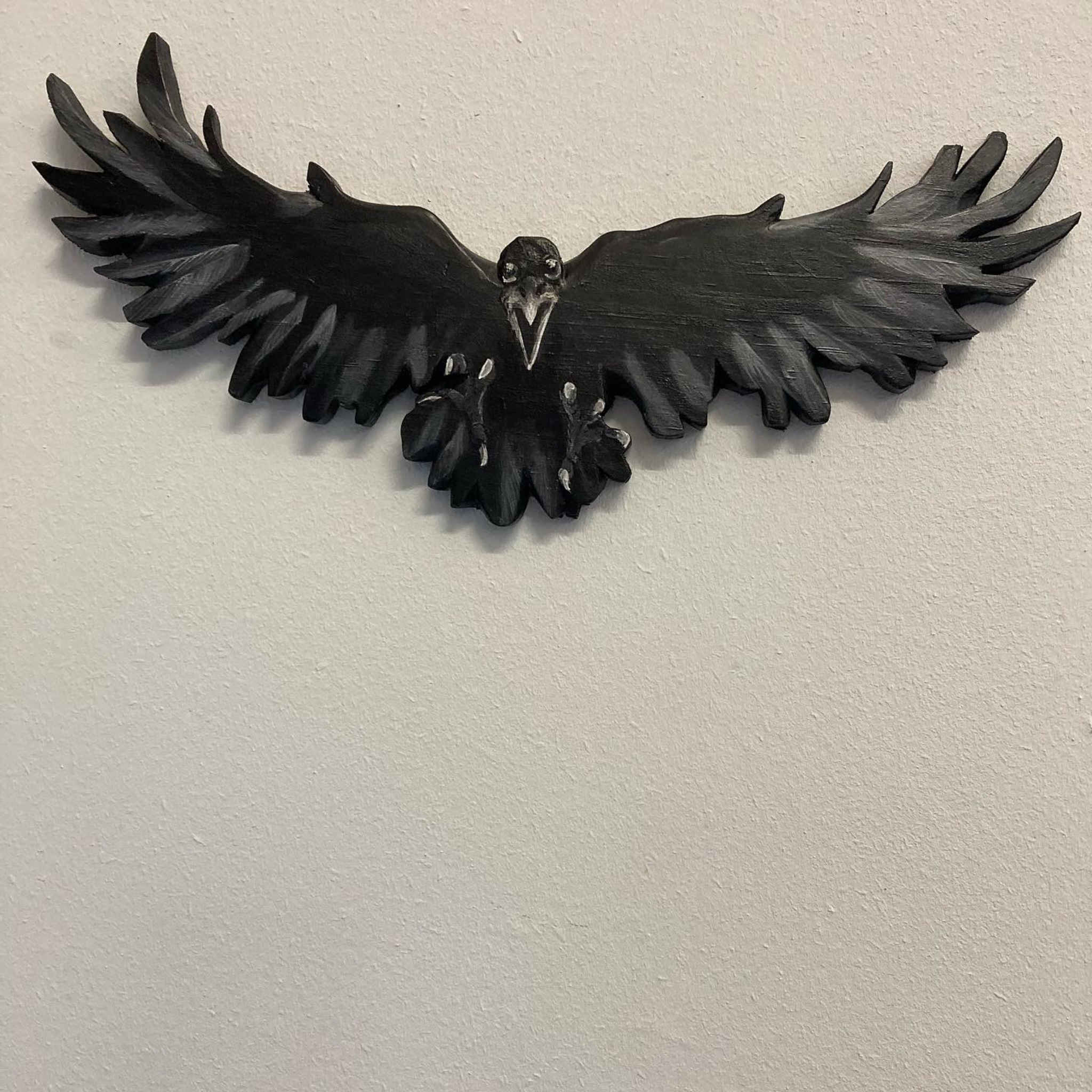 Een zwarte kraai in de aanval. Deksel van een wijnkistje, figuurzagen en daarna schuren. Beschilderd met acrylverf.