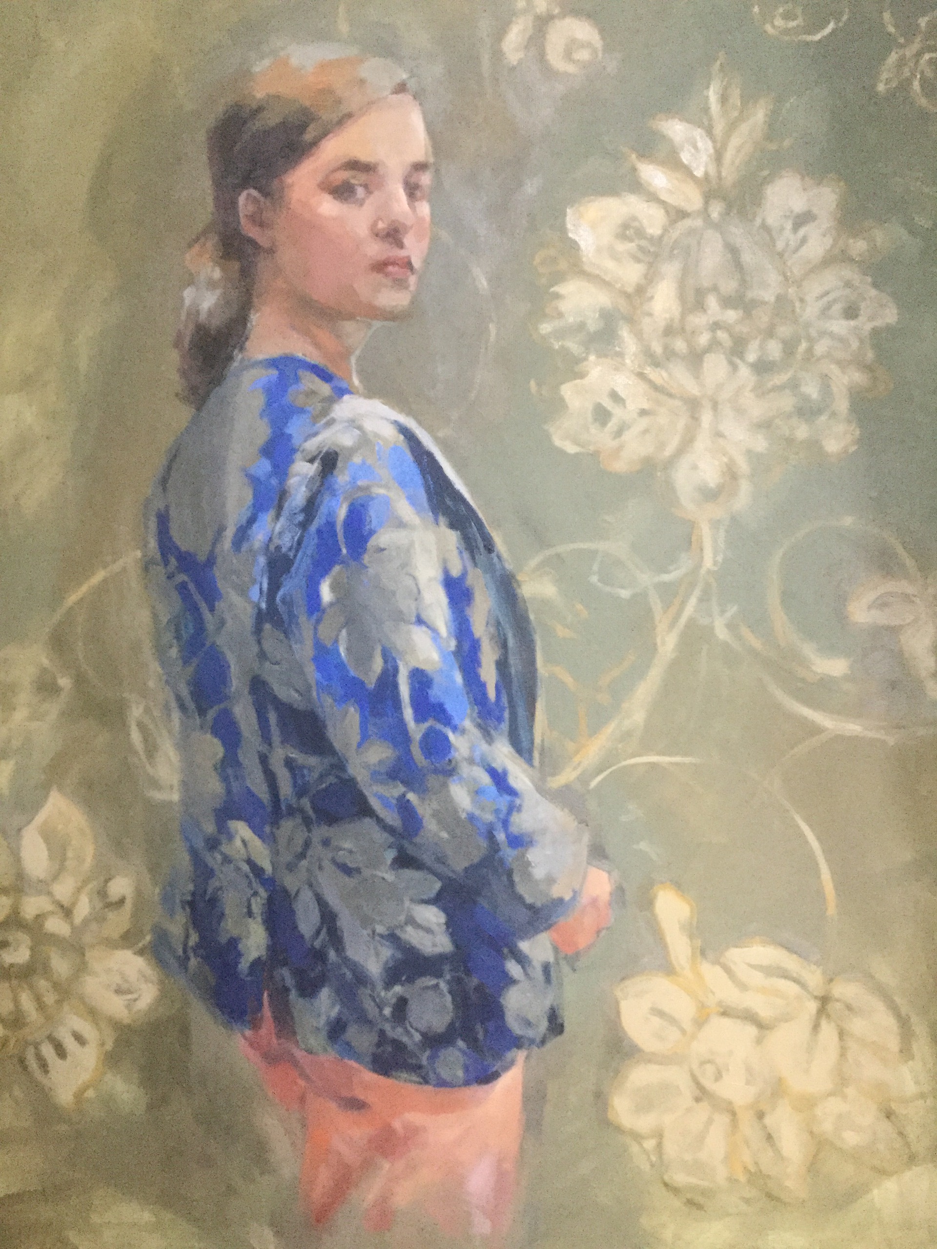 Identiteit. Het model toont een antiek 18e eeuws herenjasje van spiegel damast, ooit eigendom van en gedragen door een man van Friese adel. Het kledingstuk toont de rijkdom en benadrukt de indentiteit van de drager. Kleding heeft naast een beschermende ook een versierende, onderscheidende en soms verhullende functie. Het museumstuk (museum Opsterlân Gorredijk) wordt getoond door een vrouwelijk naaktmodel. De naaktheid is hier en daar subtiel te zien. De titel "social distance" verwijst naar de toenemende schaamte voor naaktheid en naar de Corona periode waarin het schilderij tot stand kwam.